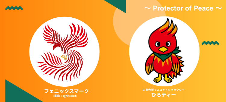 フェニックスマーク(Ignis Bird)、マスコットキャラクターの使用については、事前の許可申請が必要です。広島大学の学生団体、同窓会組織等で使用を希望される場合は、koho*office.hiroshima-u.ac.jp(*を@に変換)までお問合せください(ただし、広島大学の役員および教職員が、大学の業務のために使用する時などは事前の許可申請は不要です)