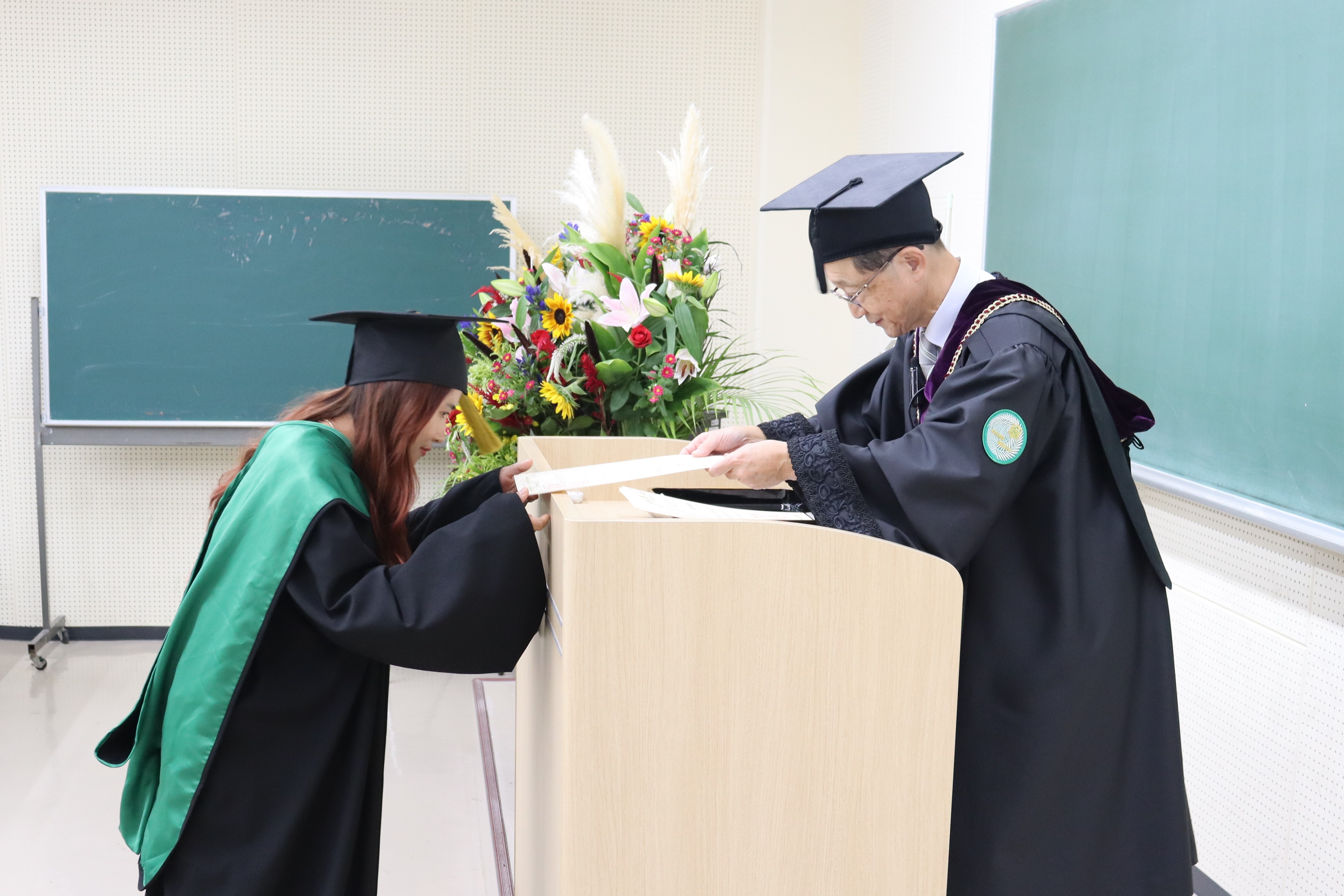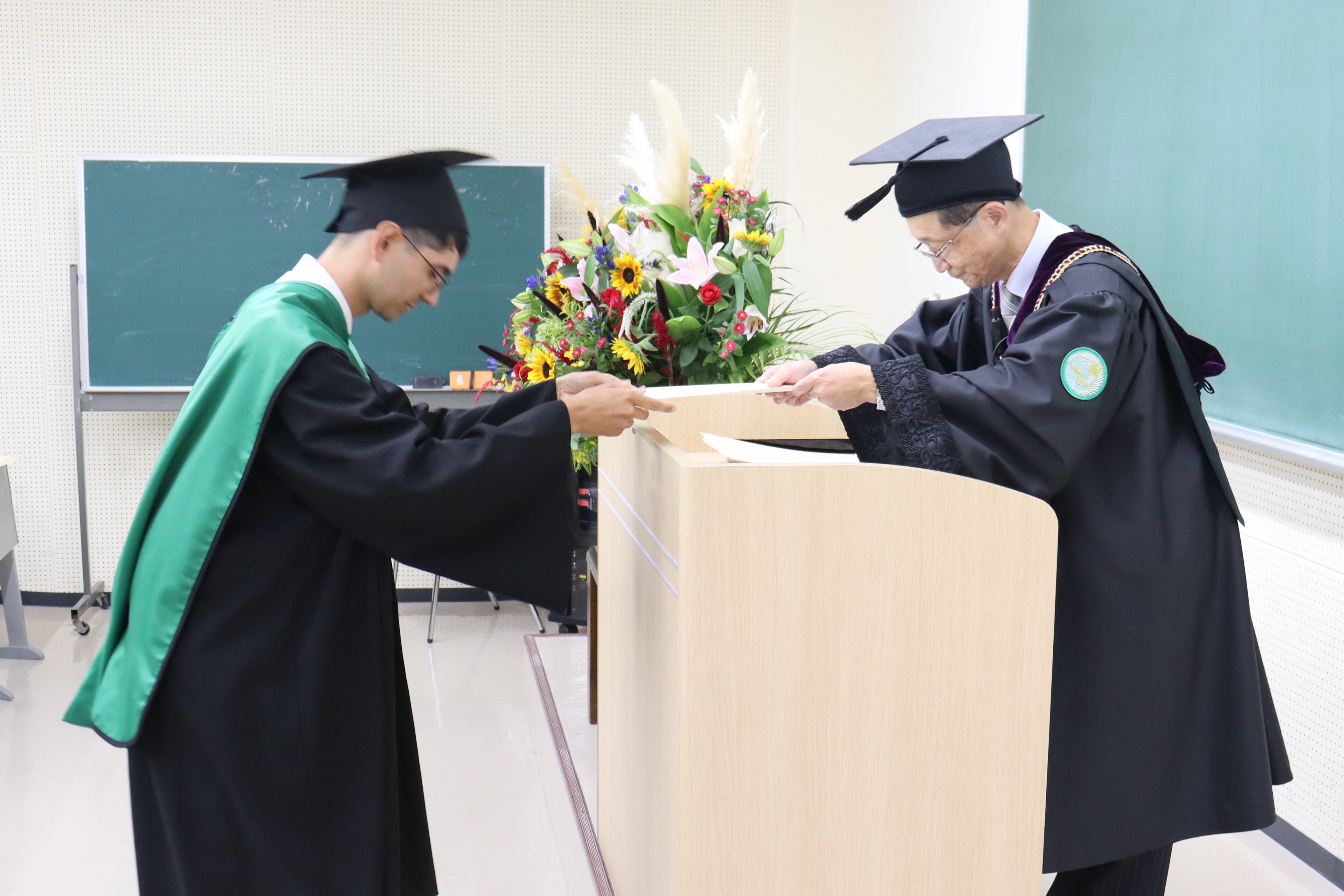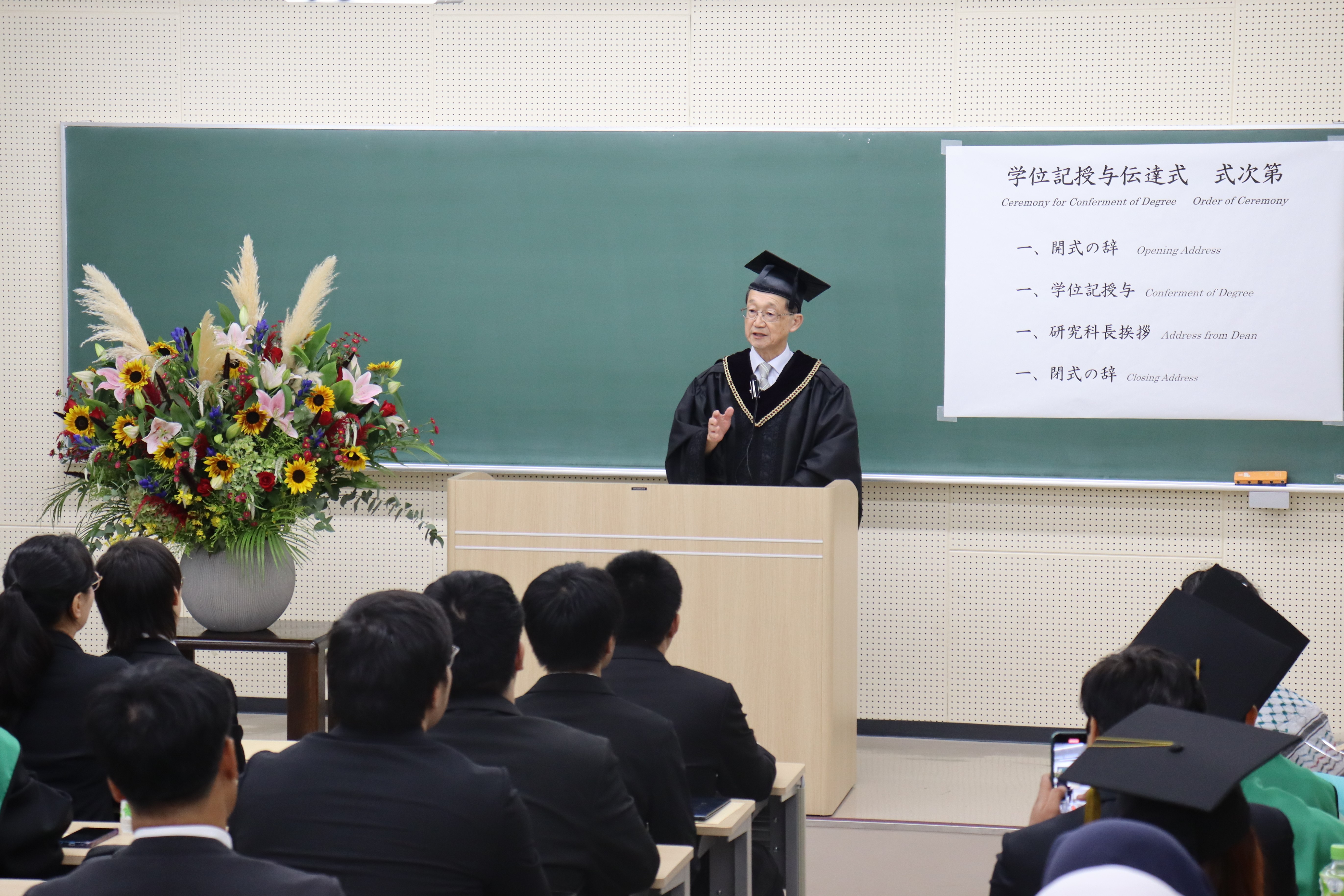 茶谷研究科長から学位記が手渡され、はなむけの言葉が贈られました。
