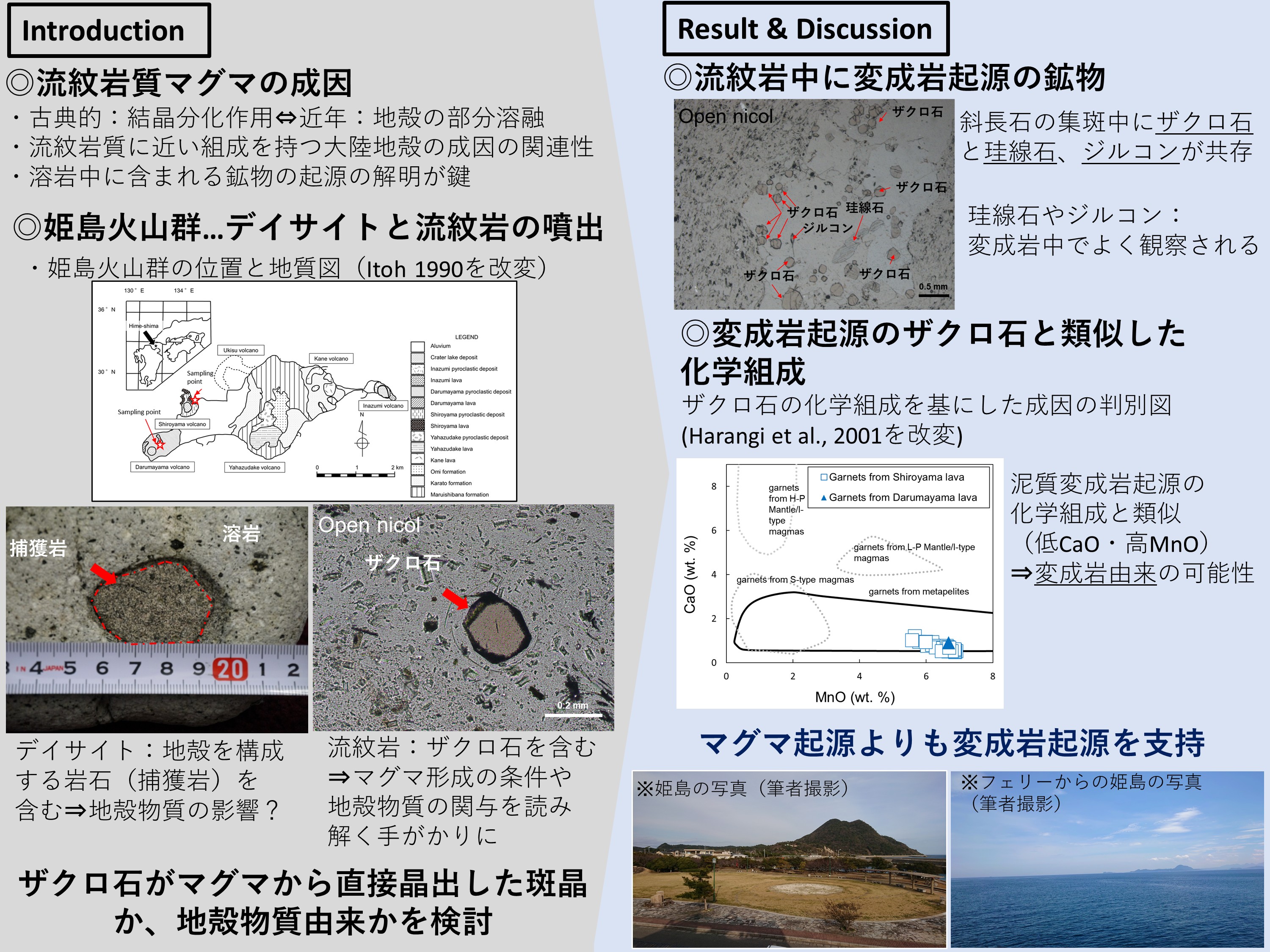 斜長石に富む鉱物集合体中にザクロ石と、変成岩に多く含まれる珪線石・ジルコンが共存すること、さらにザクロ石の高MnO・低CaO組成から、姫島火山群のザクロ石はマグマ起源斑晶ではなく変成岩由来の捕獲結晶であることを示した。