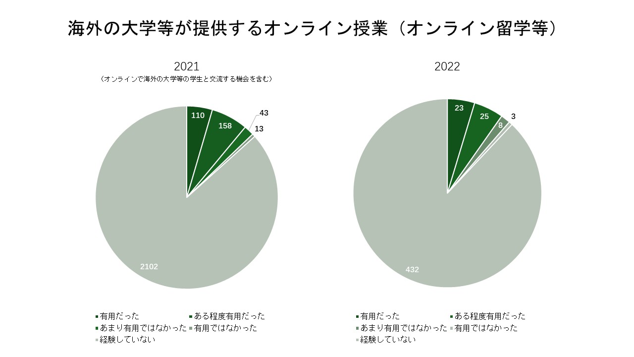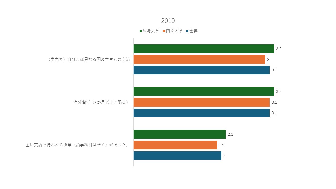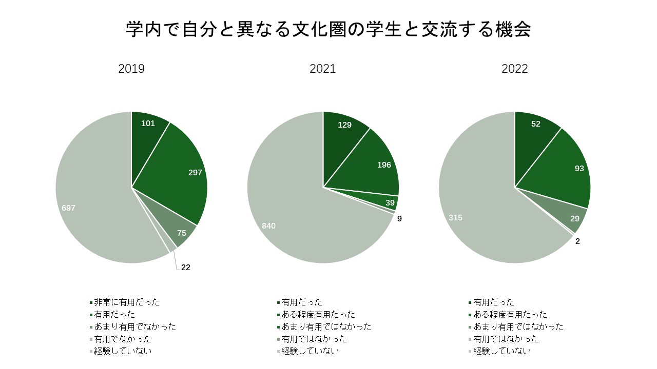 過去3回の調査結果を振り返ると、本学の学生による大学生活で身に付いた能力への主観的評価は、全体的には全国の大学の傾向と類似していました。その中で特に注目すべき点は、全国的な結果同様、異文化理解と外国語能力に対する自己評価が特に低いという結果です。さらに、外国語能力の向上につながる教育活動について、本学は学生から全国の大学と同等、またはそれ以上の評価を得ていますが、これらの活動に参加した経験のある学生が少なく、全体的な評価の向上につながっていないと推測されます。このような結果を受け、「グローバル人材を育成する一貫教育の確立」という目標を掲げる本学では、これまで実現してきた国際化の成果をより広く普及させ、学生の外国語能力の向上の実感につなげられるよう、さらなる努力が求められていることが示唆されています。