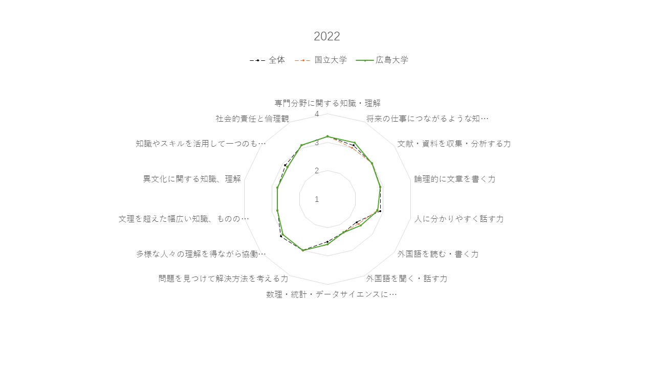 近年の大学教育では、専門知識だけでなく、協働力や問題解決力などの「汎用的能力」の育成が重視されています。しかし、学士力や社会人基礎力、就職基礎能力を議論する際には、大学が身に付けさせるべきだと考える能力や、雇用側が求める人材像に基づいて論じられることが多く、学生自身の経験に基づく視点が欠けています。「全国学生調査」は、日本の大学生の学習経験に関する貴重な調査であり、文部科学省が実施しています。本調査の目的の一つは、学生が大学生活で身に付けた能力について、学生の主観的評価を把握することにあります。これまで本センターでは、IR報告の一環として「全国学生調査」の成果を活用し、広島大学の教育活動の現状を把握してきました。今回は、過去3回の調査(2019年度、2021年度、2022年度実施)の一部結果を用いて、全国の大学、国立大学、そして本学の学生が大学生活で身に付けた能力に対する主観的評価の特徴を報告し、本学の教育活動への示唆を提示します。