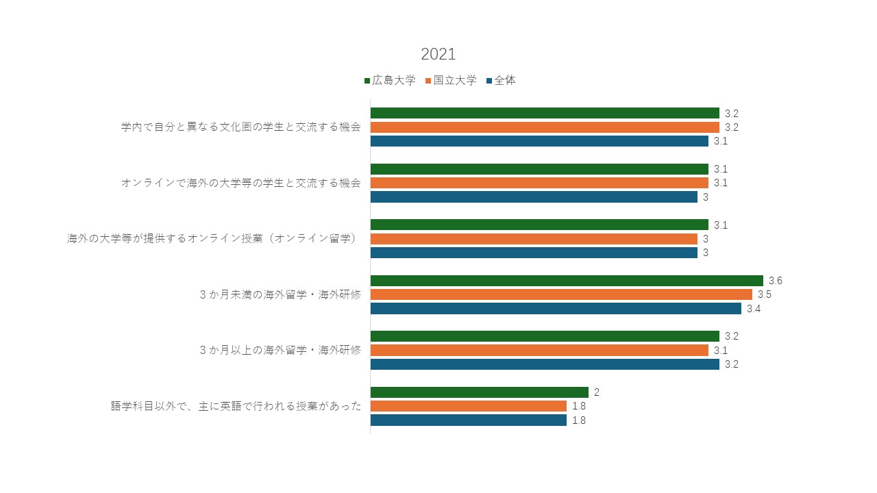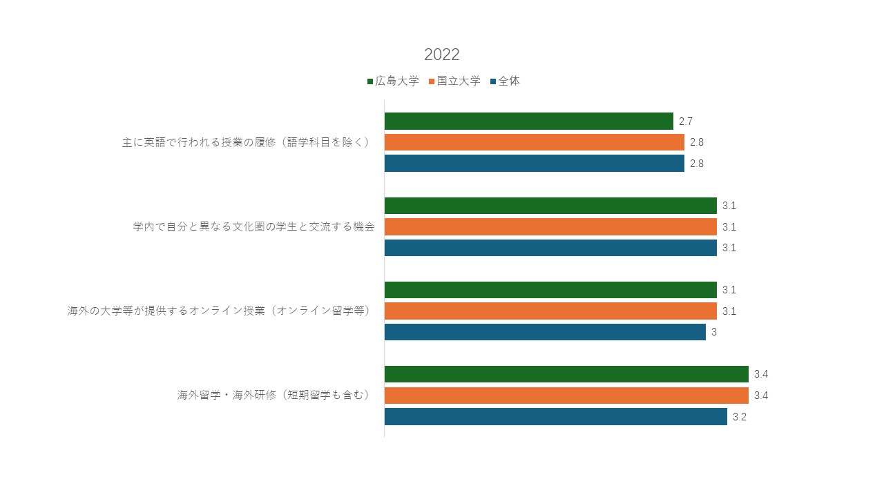 では、なぜ学生は大学教育を通じて自身の外国語能力の向上を実感できないのでしょうか。大学がどのような教育活動を提供すれば、学生に外国語能力の向上を実感させることができるのでしょうか。これらの問いに対する示唆を「全国学生調査」から見出したいと考えます。調査項目の一つに「大学在学中に経験した以下の項目はどの程度有用だったと感じますか」という設問があります。本設問からは、大学が提供した教育活動に対する学生の参加状況と評価を把握することができます。回答項目は3回の調査で多少調整されていますが、外国語能力の向上につながる可能性のある項目に着目すると、「海外留学・海外研修(短期留学を含む)」「海外の大学等が提供するオンライン授業(オンライン留学等)」「学内で自分と異なる文化圏の学生と交流する機会」「主に英語で行われる授業の履修(語学科目を除く)」という4つの項目が含まれています。外国語能力の向上につながる教育活動に参加したことのある学生による、これらの教育活動への評価を点数化した結果(図3)を見ると、全国の大学より本学の学生は、本学の提供する教育活動をおおむね有用だと評価していることが読み取れます。