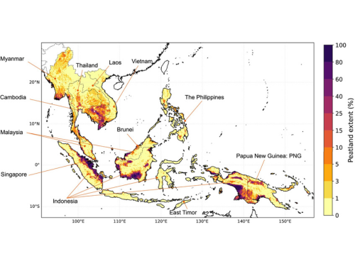 Map highlighting Southeast Asia’s peatlands, which act like giant carbon storage areas but are at risk of deforestation and drainage (Adapted from Masayuki Kondo et al., Global Biogeochemical Cycles, September 24, 2025).