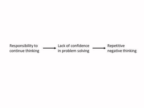 There were wide individual differences in headache severity even among this subsample. This group may be mainly experiencing tension-type headaches. A high responsibility to continue thinking predicted reduced headache severity one month later. On the other hand, a lack of satisfaction in problem-solving led to severer headaches one month later (solid blue line in Figure 2a). Figure 3 integrates these findings with the cognitive process depicted in Figure 1. As the responsibility to continue thinking is located at an earlier stage of repetitive negative thinking, it is still associated with constructive problem-solving and is less pathological. Therefore, repetitive negative thinking at this stage can distract one from headache pain. However, when negative thinking leads to thwarted problem-solving (Lack of satisfaction in problem-solving), it will increase psychological and somatic distress (e.g., muscle tension), thus worsening headache symptoms.