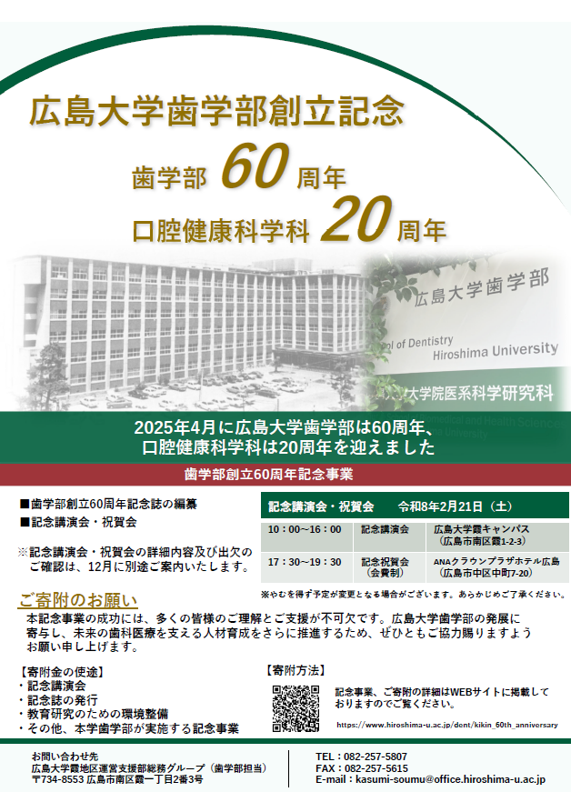 広島大学歯学部は1965年の設置から数えて60周年、また、口腔健康科学科は2005年の設置から数えて20周年の記念すべき年を迎えることとなりました。