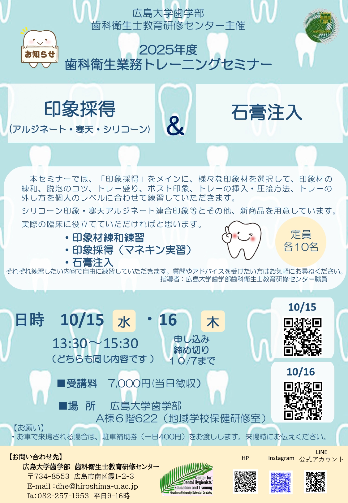 広島大学歯学部歯科衛生士教育研修センターでは、2025年10月15日(水)・16日(木)に「歯科衛生士業務トレーニングセミナー 印象採得・石膏注入」を開催します。