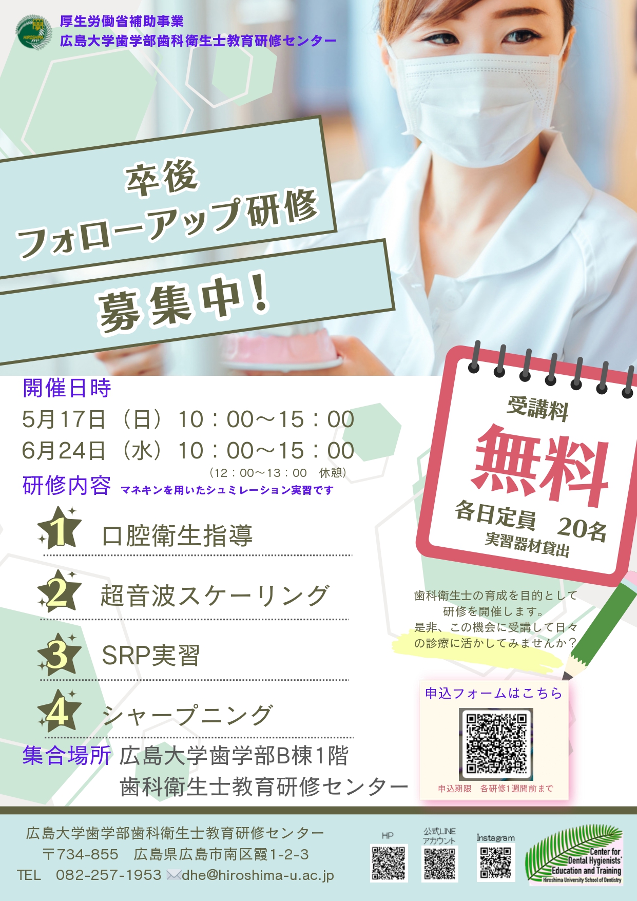 広島大学歯学部歯科衛生士教育研修センターでは、歯科衛生士の臨床実践能力の育成を目的として「卒後フォローアップ研修」を開催します。