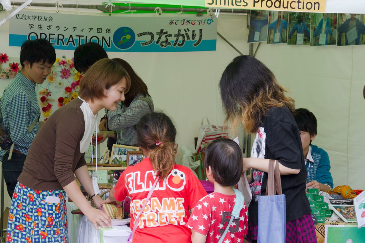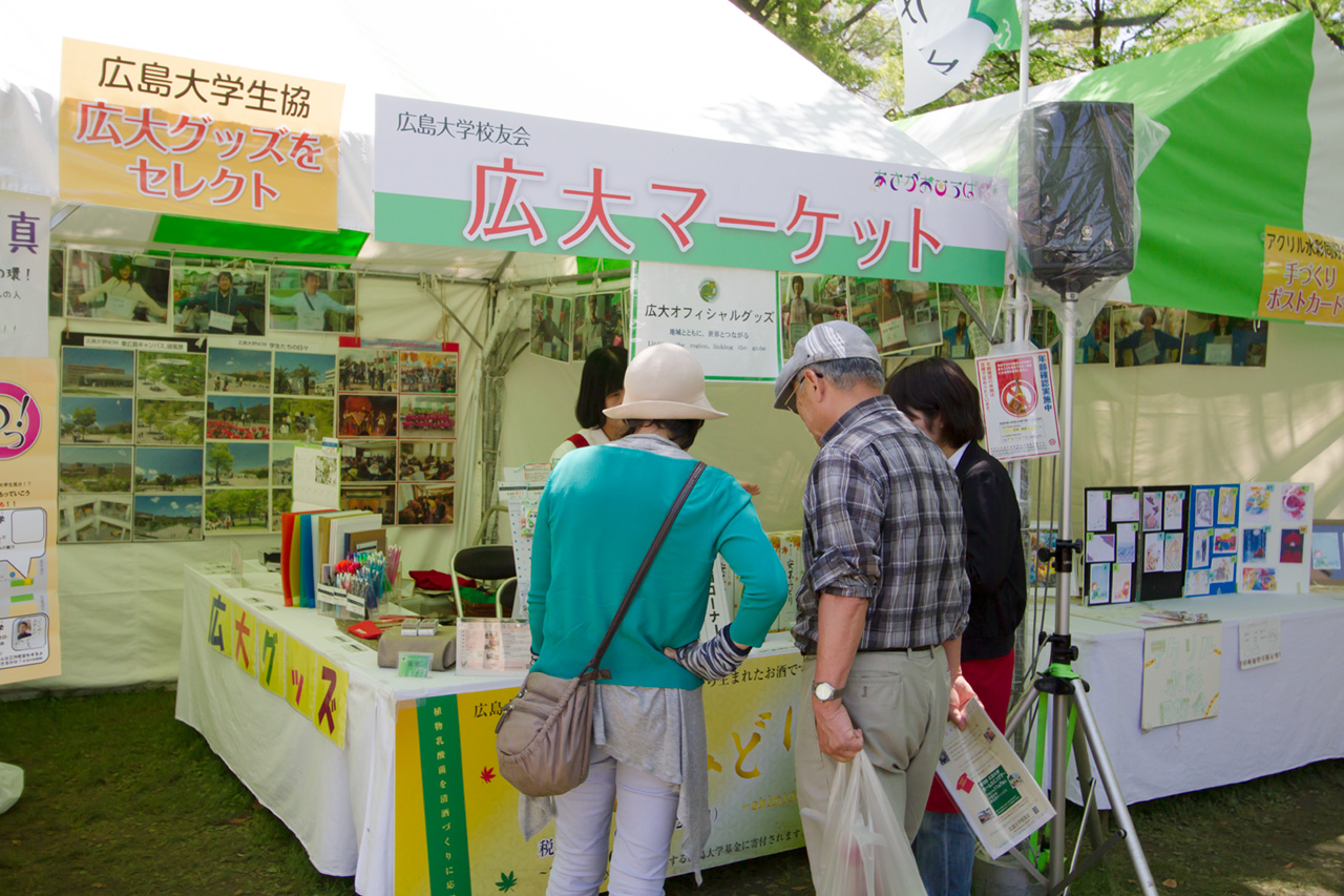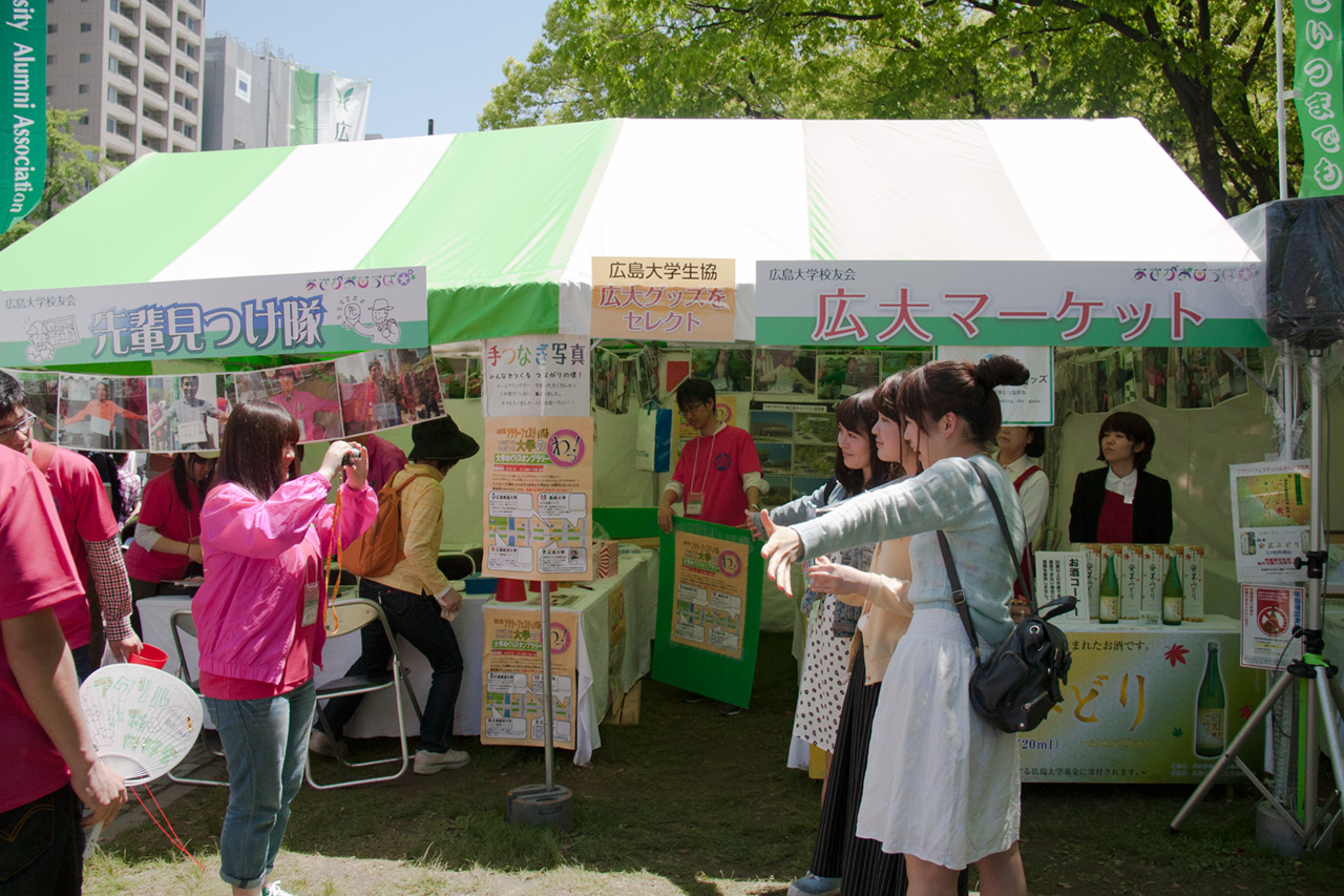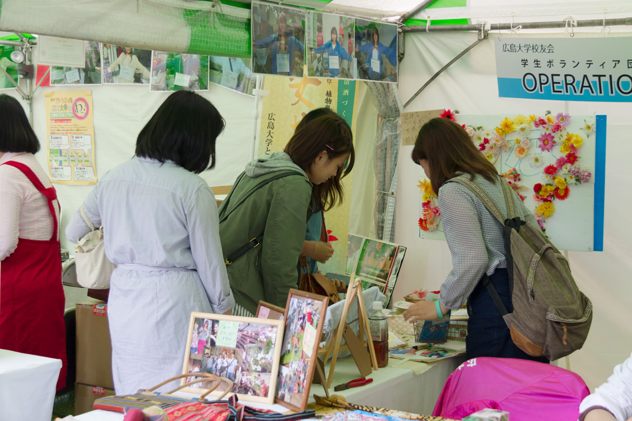 『活動展示・販売ブース』では,広大卒業生を探し,絆を結び直す「先輩見つけ隊」,学生ボランティア団体「OPERATIONつながり」「Smiles Production」による海外品雑貨販売・活動展示,「広島大学生協」による広大グッズ販売,「アクリル水彩同窓会」による手づくりポストカード販売を行いました。