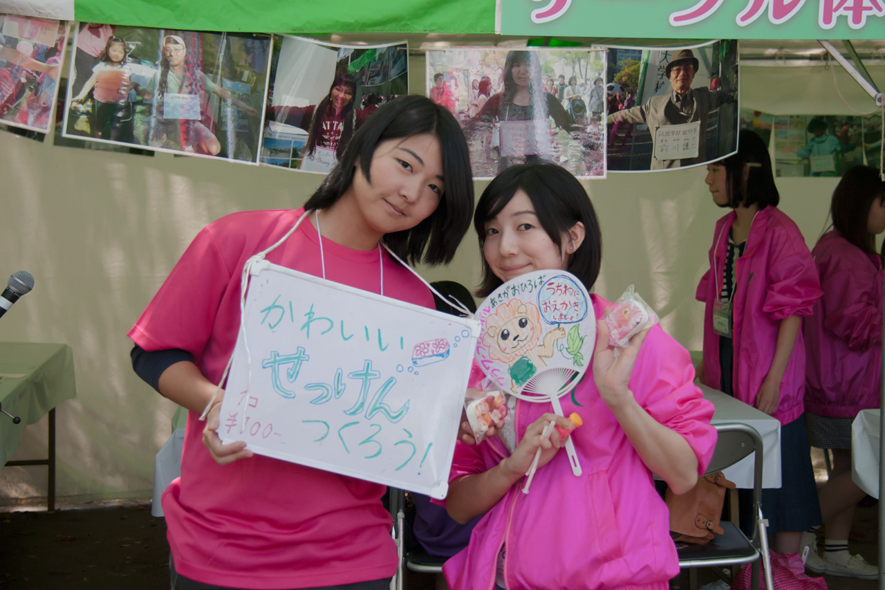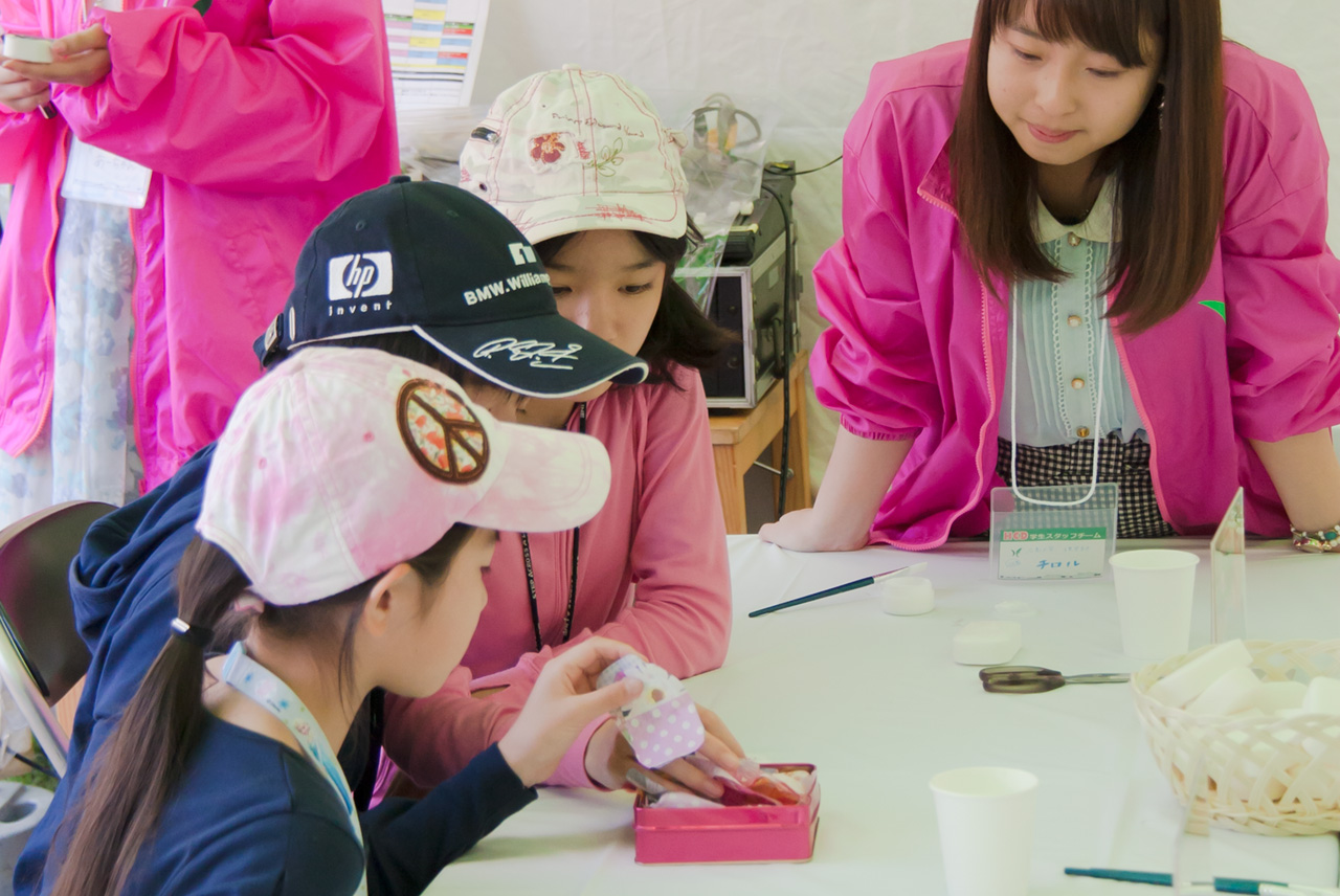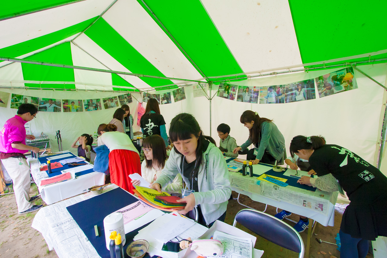 『サークル体験ブース』では,「書道部」による習字体験,「キャンドルサークル灯」による手づくりキャンドル,「手芸部」による石けんデコパージュ,「ホームカミングデー学生チーム」による校友会オリジナルうちわへのお絵かきなどを展開しました。