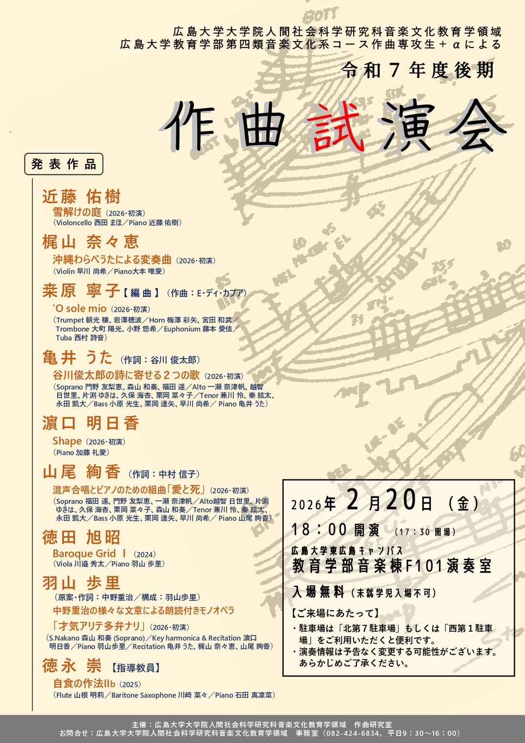 【2026/2/20開催・東広島】大学院人間社会科学研究科音楽文化教育学領域 ・教育学部第四類音楽教育学プログラム作曲専攻生+αによる令和7年度後期の作曲試演会を開催します