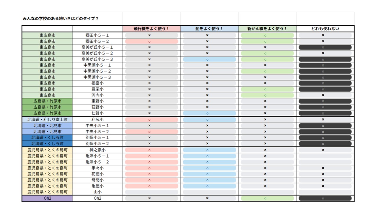 まず、自分たちの住む地域がどのような輸送手段を利用しやすいかを確認。スプレッドシートに、新幹線、高速道路、大きな港、空港などの有無を入力していくと、陸路・海路・空路の選択肢が多い地域(広島など)と、海路と空路が生命線である島嶼部(利尻,徳之島)という、参加校の置かれた環境の大きな違いが可視化されました。