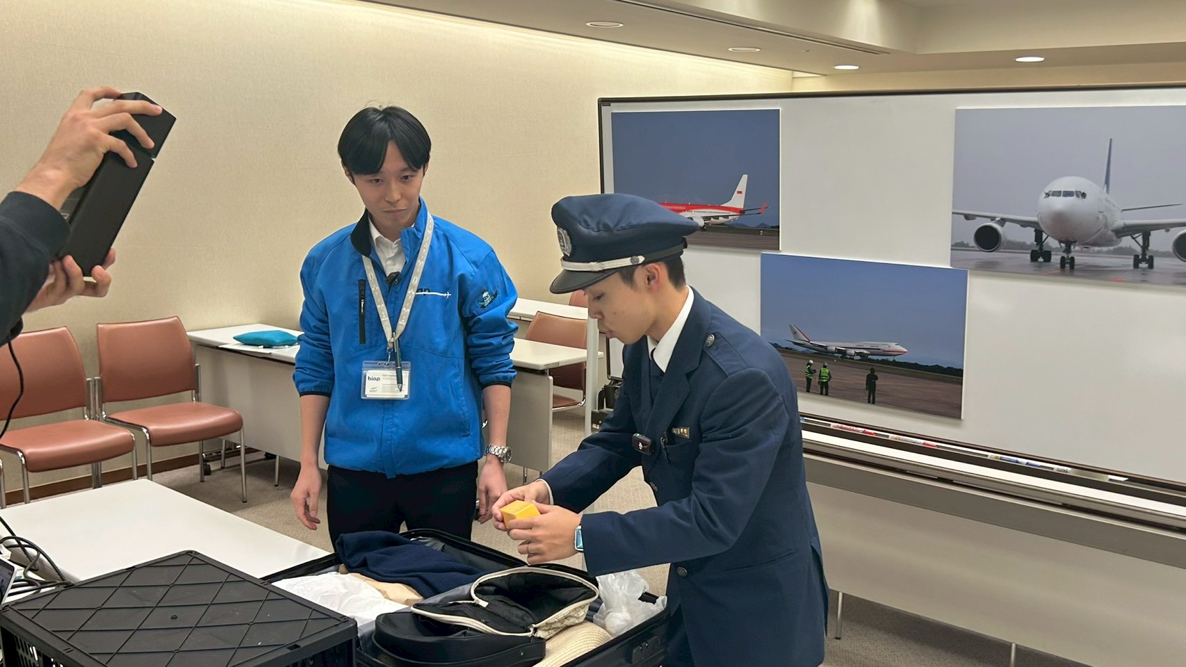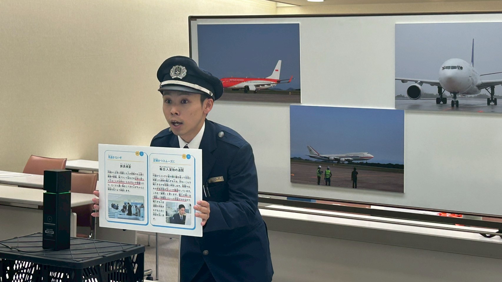 また、広島空港からは、税関や航空管制に関わる職員の方のお仕事も紹介されました。航空管制官の方の英語での模擬管制、税関の方の寸劇に子供たちも大盛り上がり。空港が「国境」としての機能も持っていることを学びました。