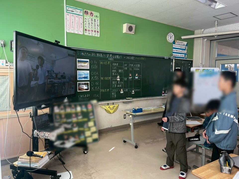 続いて、各空港の担当者の方に、リアルタイムで質問を投げかけました。利用者数、1日の便数、外国行きの便数、滑走路の長さなどのデータが出揃うと、子どもたちはその違いに驚き、「広島空港の滑走路は、利尻や徳之島の倍近くある!」「利尻と徳之島は外国行きの便がゼロだけど、広島は国際線がたくさんある」といった発見が次々と発表されました。これらの比較を通して、都市部の拠点空港と、島々の生活を支える生活路線としての空港という、それぞれの異なる役割と重要性が浮き彫りになりました。