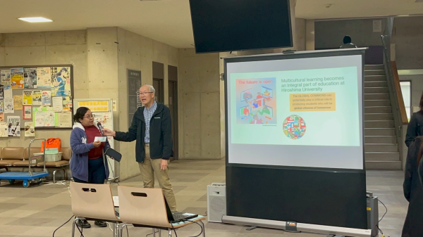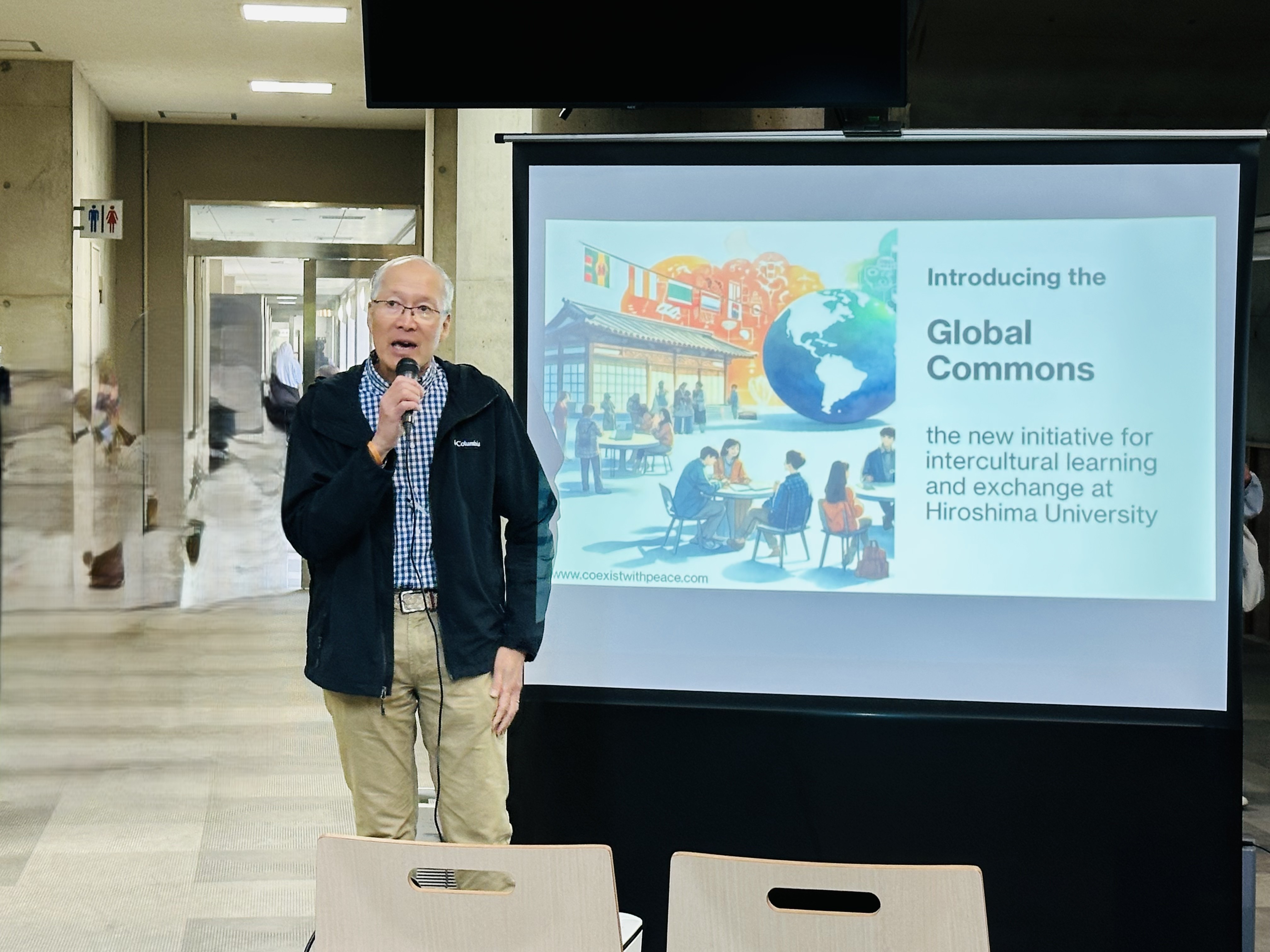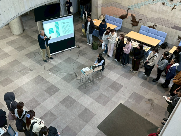 2026年4月23日(木)正午から、教育学部L棟1階玄関ホールにて、グローバルコモンズのキックオフイベントを開催しました。丸山教育学部長による挨拶、3名のQTAへの辞令交付式に続き、コーディネーターのローレンス先生よりグローバルコモンズおよびグローバルラーニングセンターの紹介が行われました。