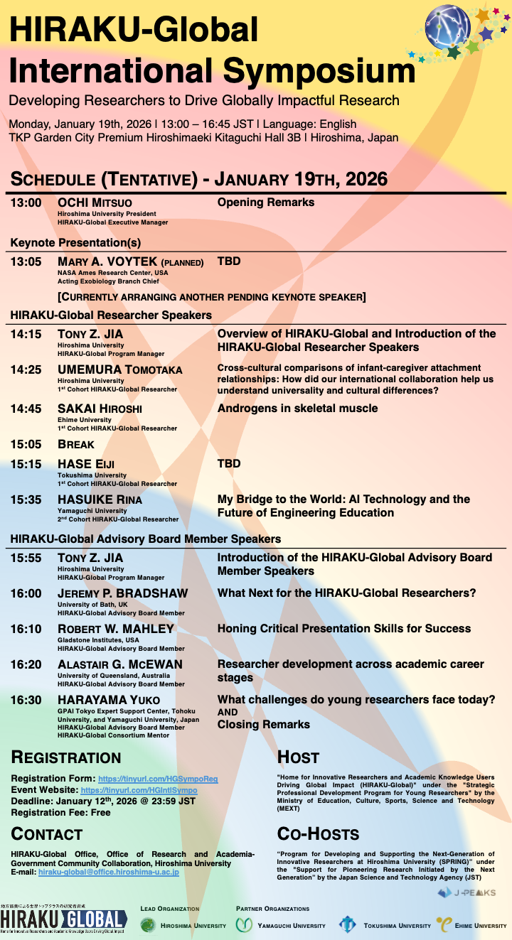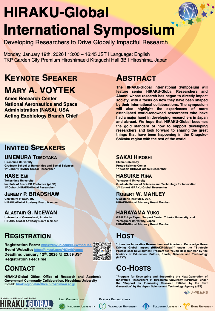 As such, the HIRAKU-Global International Symposium will feature senior HIRAKU-Global Researchers and Alumni whose research has begun to directly impact society, with a focus on how they have been shaped by their international collaborations. The symposium will also highlight the experiences of more established world-renowned researchers who have had a major hand in developing researchers in Japan and abroad. We hope that HIRAKU-Global becomes the gold standard of how to support developing researchers, and look forward to sharing the great things that have been happening in the Chugoku-Shikoku region with the rest of the world!