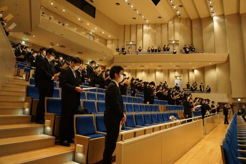 To halt the spread of COVID-19, the ceremony was divided into two sessions: one in the morning for undergraduate and advanced course students (venue: Higashi-Hiroshima Sports Park), and the other in the afternoon for graduate students (venue: Satake Memorial Hall, Higashi-Hiroshima Campus). Only graduating students participated in the ceremony. The event was live-streamed on YouTube.