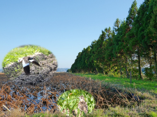 Image shows shelterbelt research site. Birds have been digitally added to the image for illustrative purposes. (Masumi Hisano/Hiroshima University)