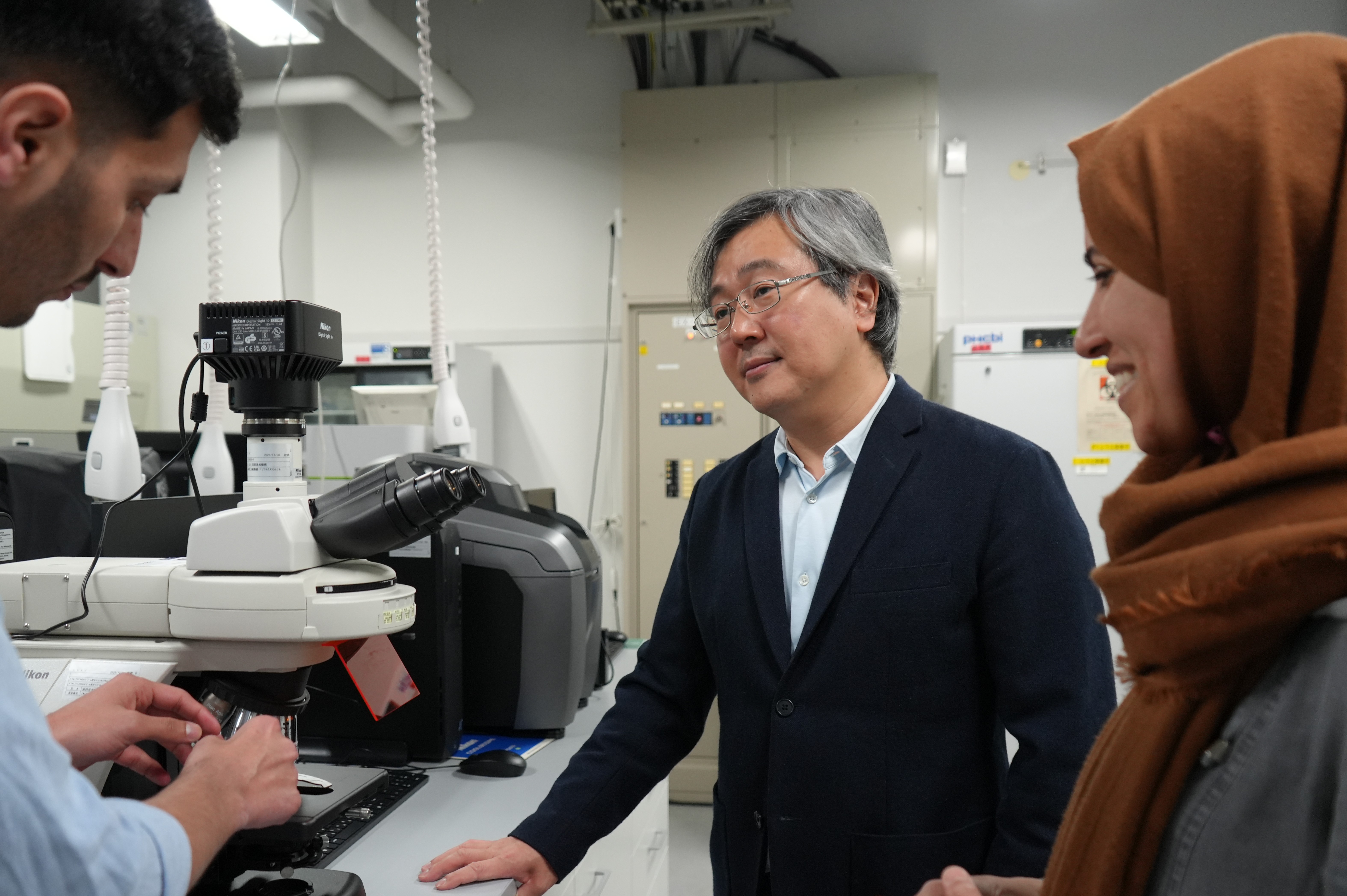 Professor Maruyama interacting with his graduate students (Hiroshima University Public Relations Office)