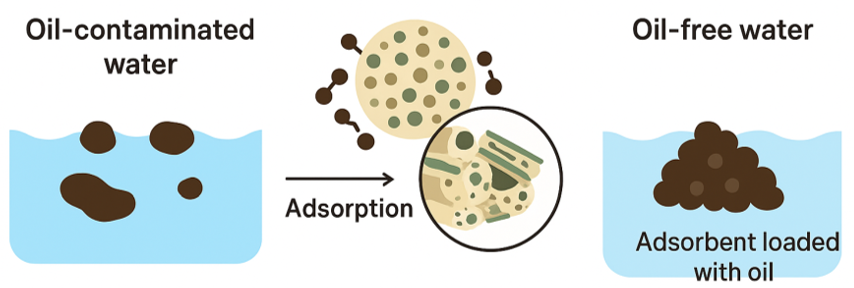 Illustration of batch adsorption of medium-heavy crude by chitosan/cellulose acetate@bentonite (CS/CA@BT) composite beads (Mohamed Ibrahim / Hiroshima University)