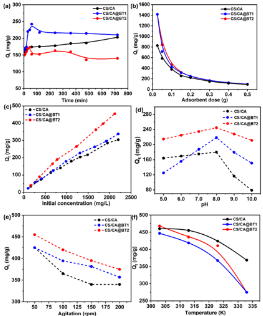 Adsorption kinetics of the chitosan/cellulose acetate@bentonite (CS/CA@BT) composite beads under different conditions (Farag et al. Polymers for Advanced Technologies, March 17, 2026)