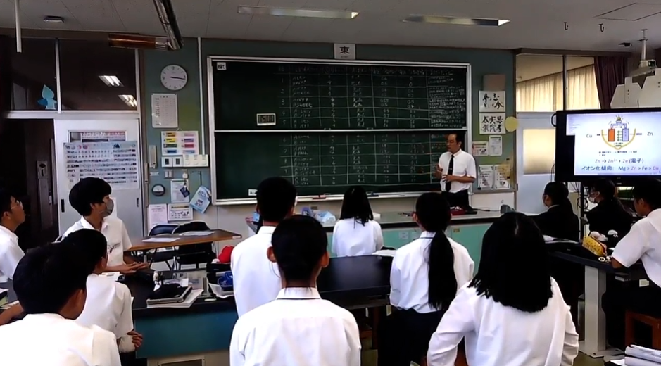当日は中学生39名を対象に「くだもの電池で「電気」と「化学」を学ぼう」と題して授業を行いました。大学の説明や自己紹介から入り、電池の仕組みや実験の説明を行いました。大学生2名もサポートに入り、実際にくだものを使って電池を作る実験を行いました。生徒たちは時間が経つのも忘れて積極的に実験を楽しんでいました。