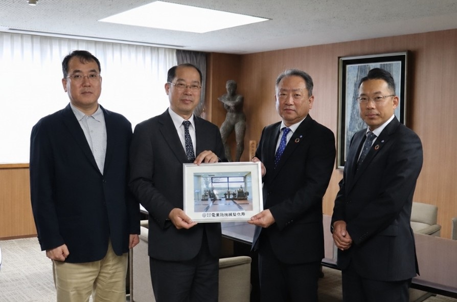 2026年4月24日、株式会社電業社機械製作所 中国支店長 笠西章弘 様が来学され、昨年同社へ寄贈したペルトン水車について、同社での設置後の様子を収めた写真パネルをご恵与いただきました。