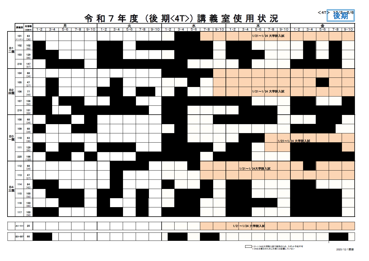 講義室の空き状況は以下のとおりです。ただし、表で空白となっている場合でも個別に予約が入っている場合がありますので注意してください。