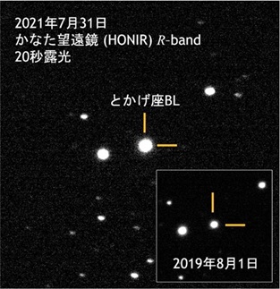 今澤さんの観測成果。画像中心の「とかげ座BL」が右下の2019年と比べて (2倍以上) 明るくなった様子が見て取れる。通常は左隣の星 (明るさがほぼ一定の星) の方が明るいが、2021年はとかげ座BLの方が明るくなっている。
