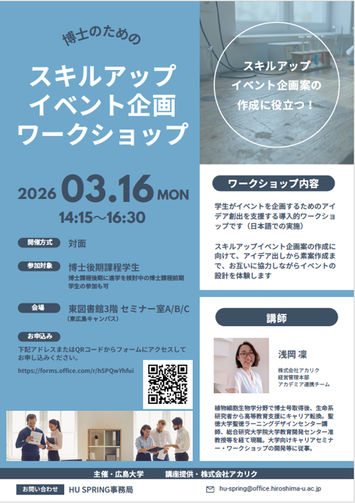E-mail: hu-spring*office.hiroshima-u.ac.jp ※*を半角@に置き換えてください。
