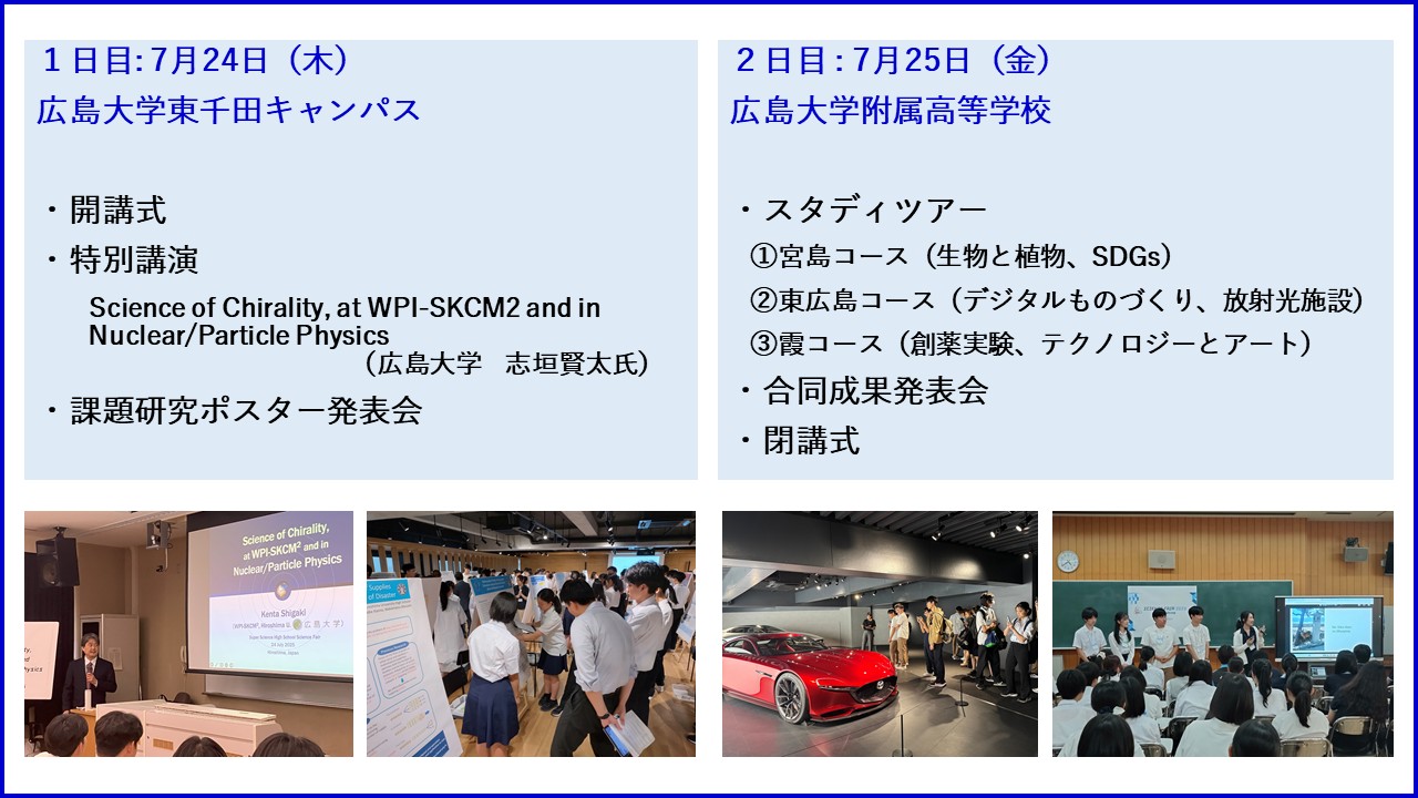 広島大学附属高等学校は、スーパーサイエンスハイスクールとして、韓国のチョナンチュンアン高等学校、ムンサンスオク高等学校、タイのプリンセスチュラポーンサイエンスハイスクール・ムクダハン校と科学教育カリキュラムの開発を目的とした海外交流事業を行っており、令和7年度は7月24日(木)~7月25日(金)に共同研修を実施しました。この研修の目的は、参加する生徒・教員等が、最先端の科学に関する講義、課題研究等を通して交流し、グローバルな視点から物事を捉え、考え、判断し、率先して行動できる資質・能力を育成することです。