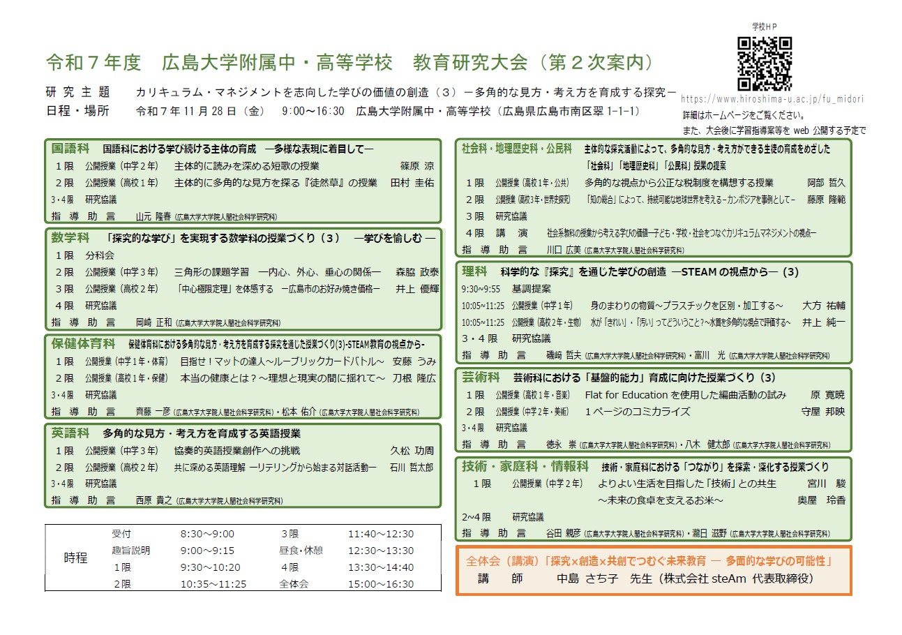 広島大学附属中・高等学校では、教育研究大会を令和7年11月28日(金)に開催いたします。