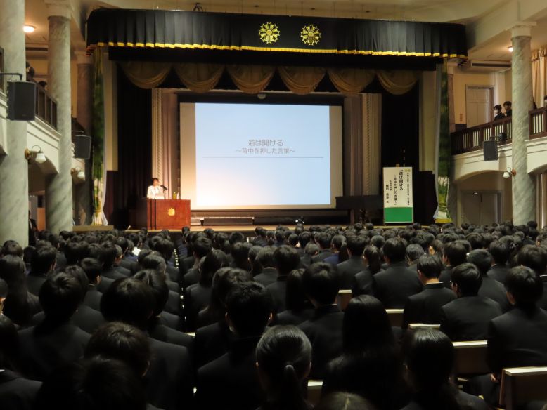 創立記念式は、「開校記念日の歌」斉唱で始まり、学校長講話、卒業生による記念講演と続きます。今年は、広島県知事の横田美香様に、「道は開ける ~背中を押した言葉~」という題目でご講演いただきました。