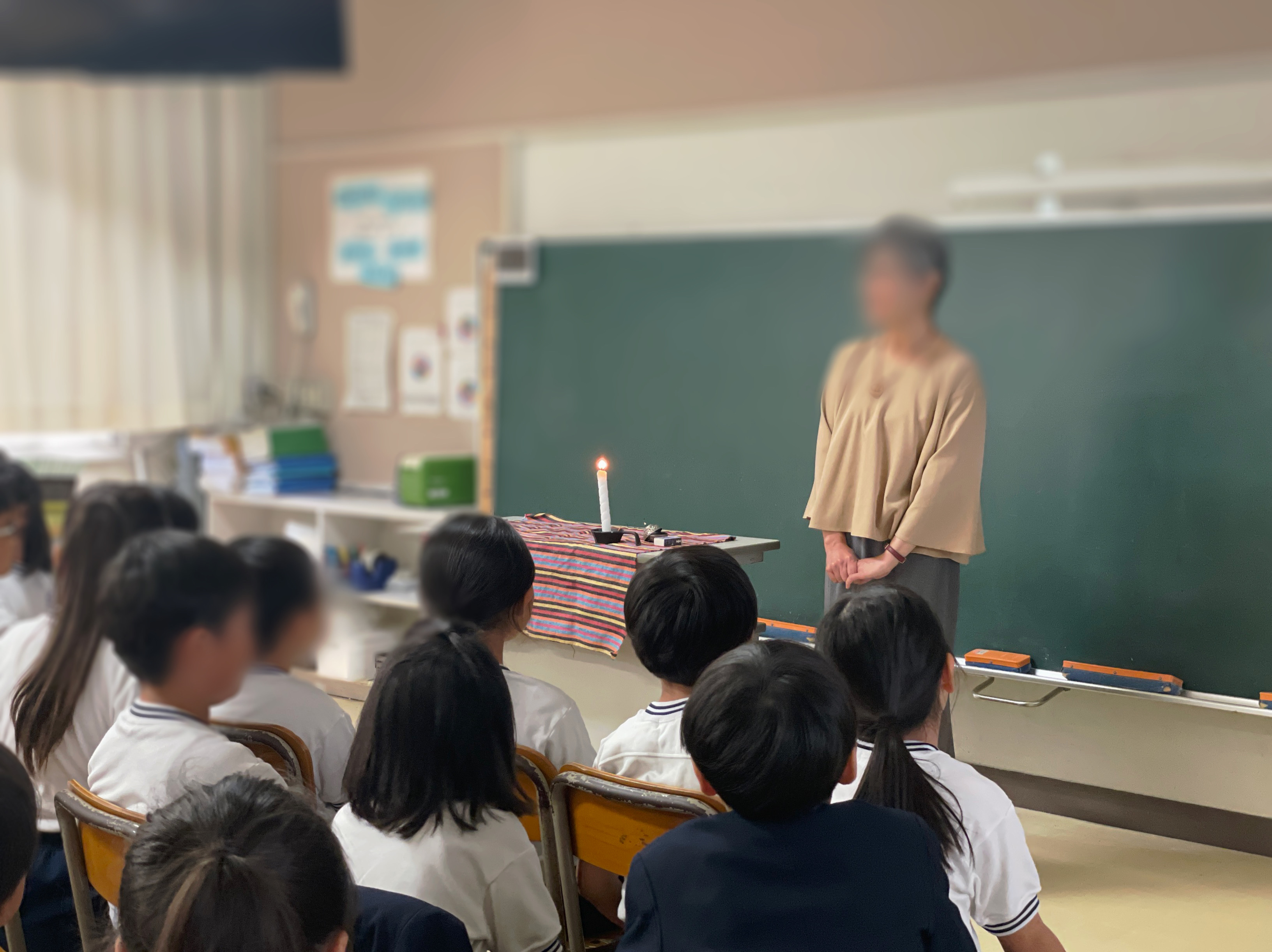 薄暗くした教室で、ろうそくの明かりを灯して語られるお話に、子どもたちはじっと耳を傾けていました。