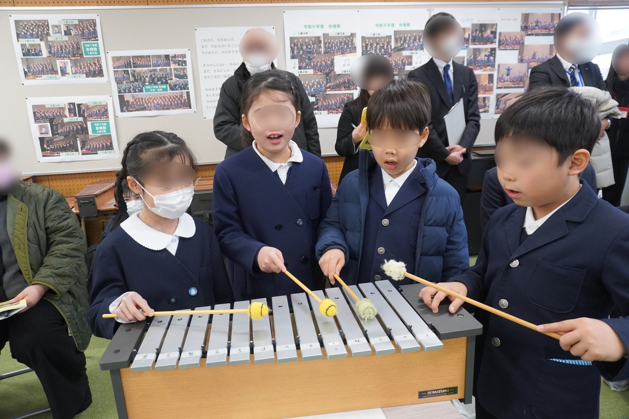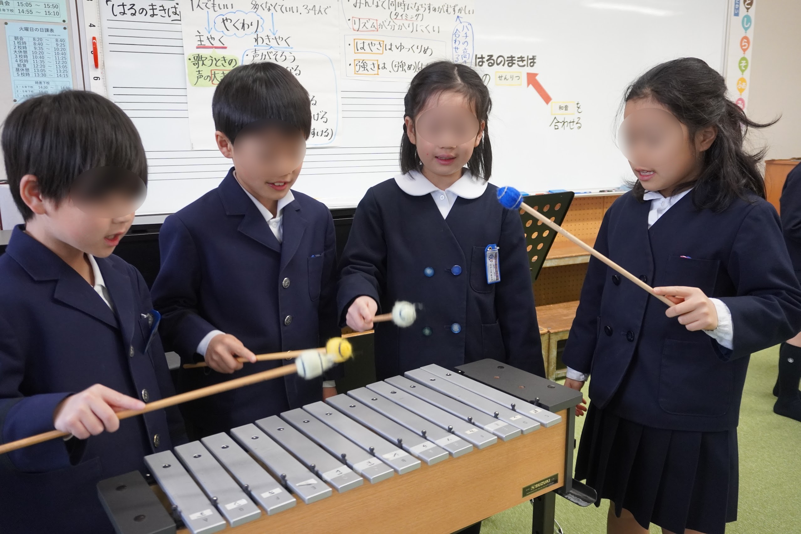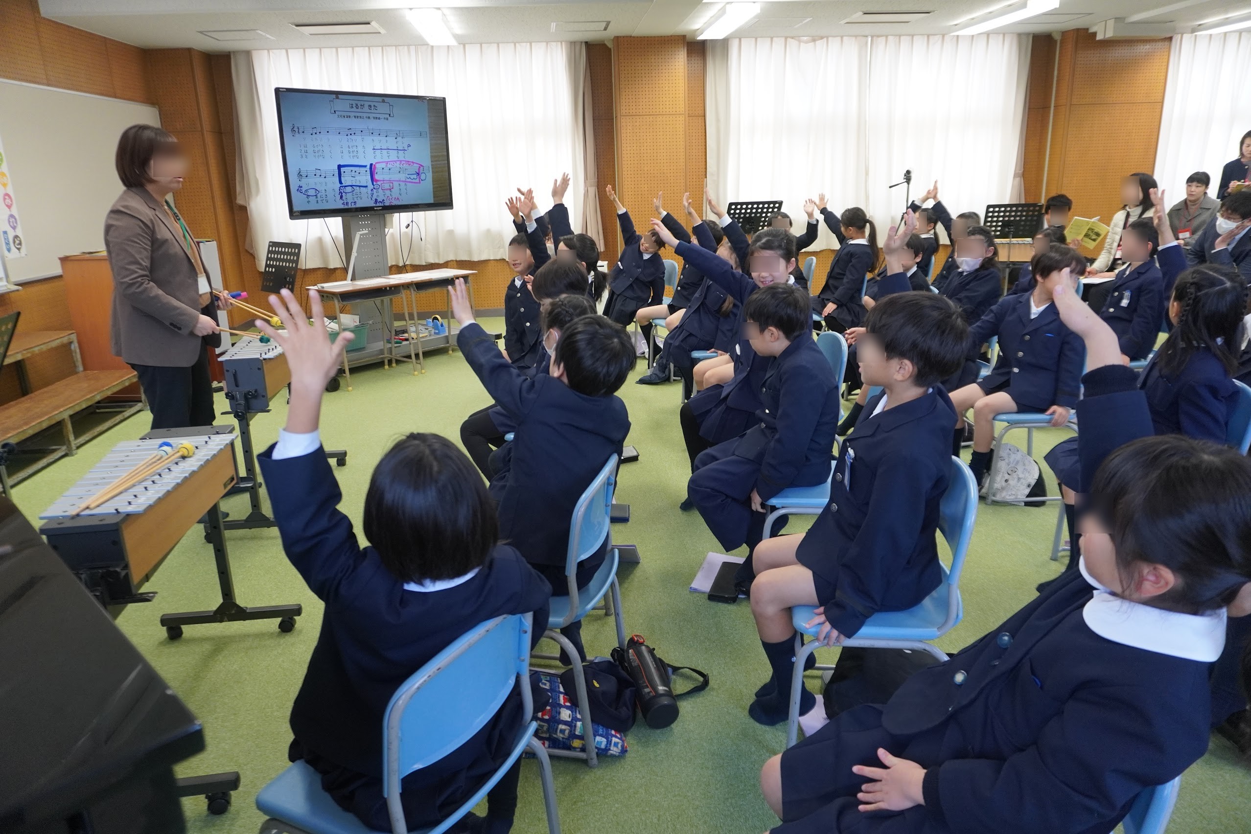 2年「合うってどんな感じ?-パートナーソングで歌ってみよう-」では、和音伴奏に合わせて歌ったり、パートナーソングを歌ったりしながら、音の重なりを考えました。自分たちで歌って確かめながら「合う」ことについて幅広い感じ方を共有することで、「合う」ことの価値を見つけていました。