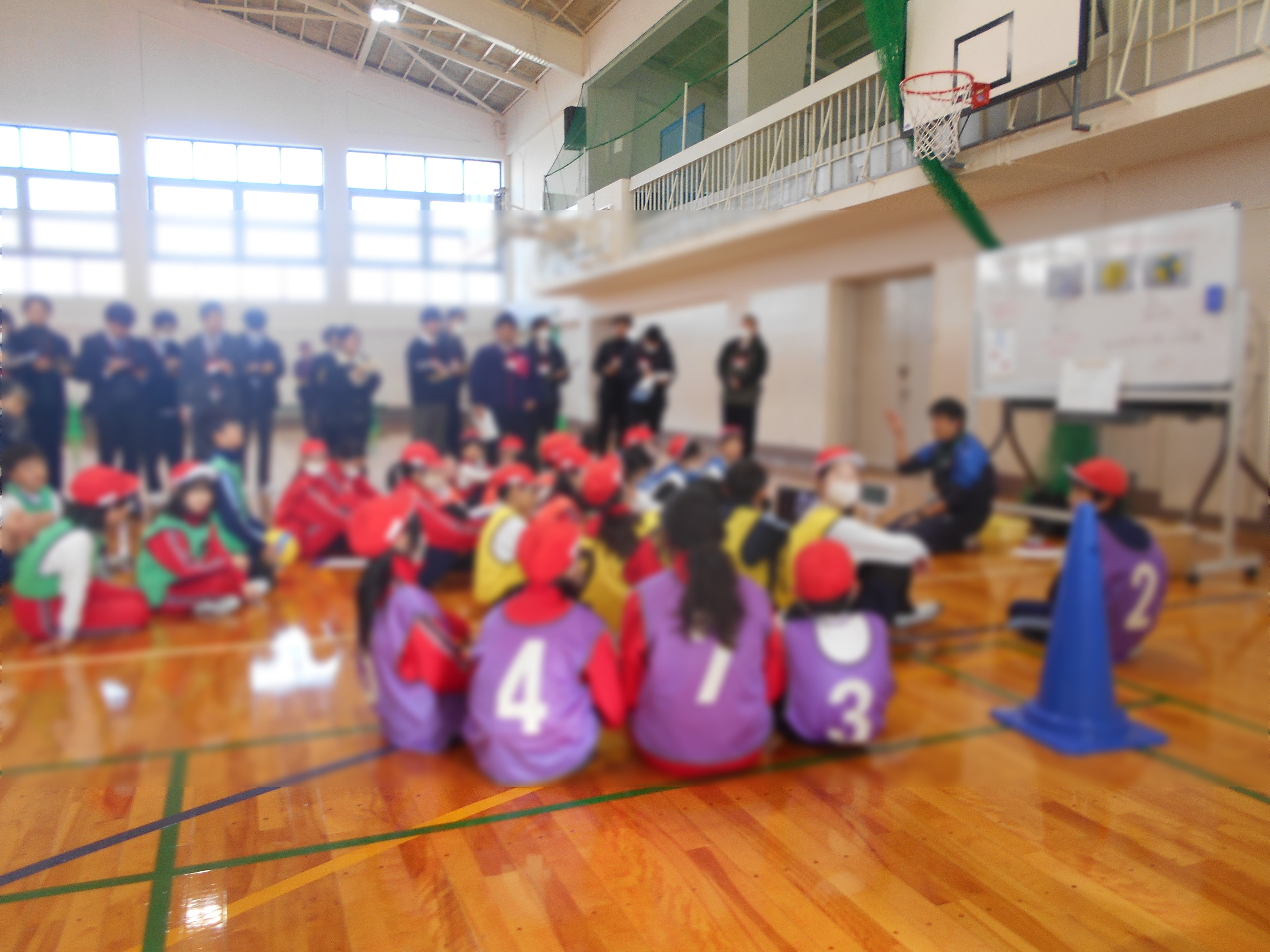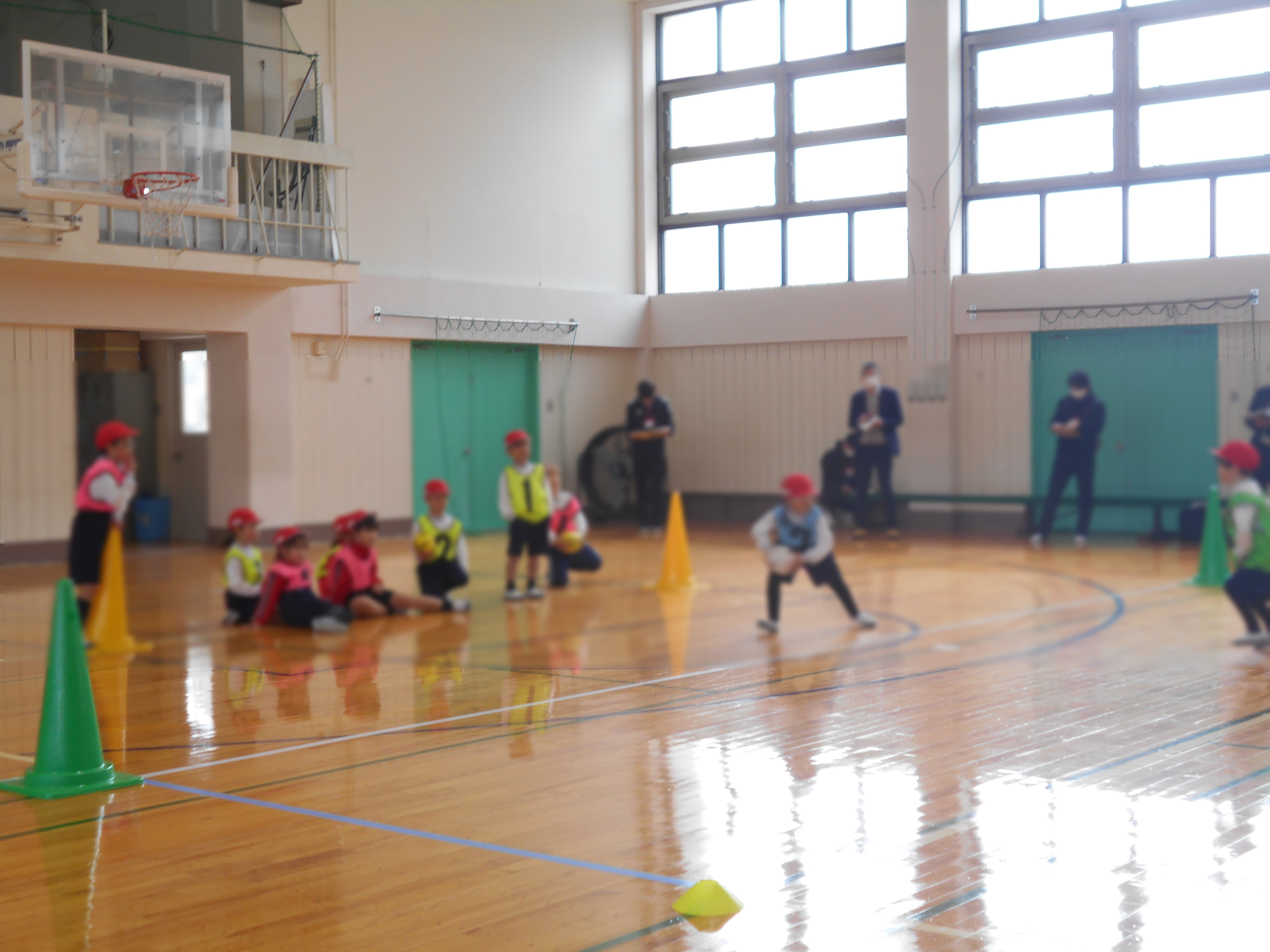 1年「ボールをつないで、ゴールをめざせ」では、ボールゲームを行いました。子どもたちは味方や守備側の人の位置を見て、パスを通すための動きを考えながら、実際にゲームを楽しんでいました。