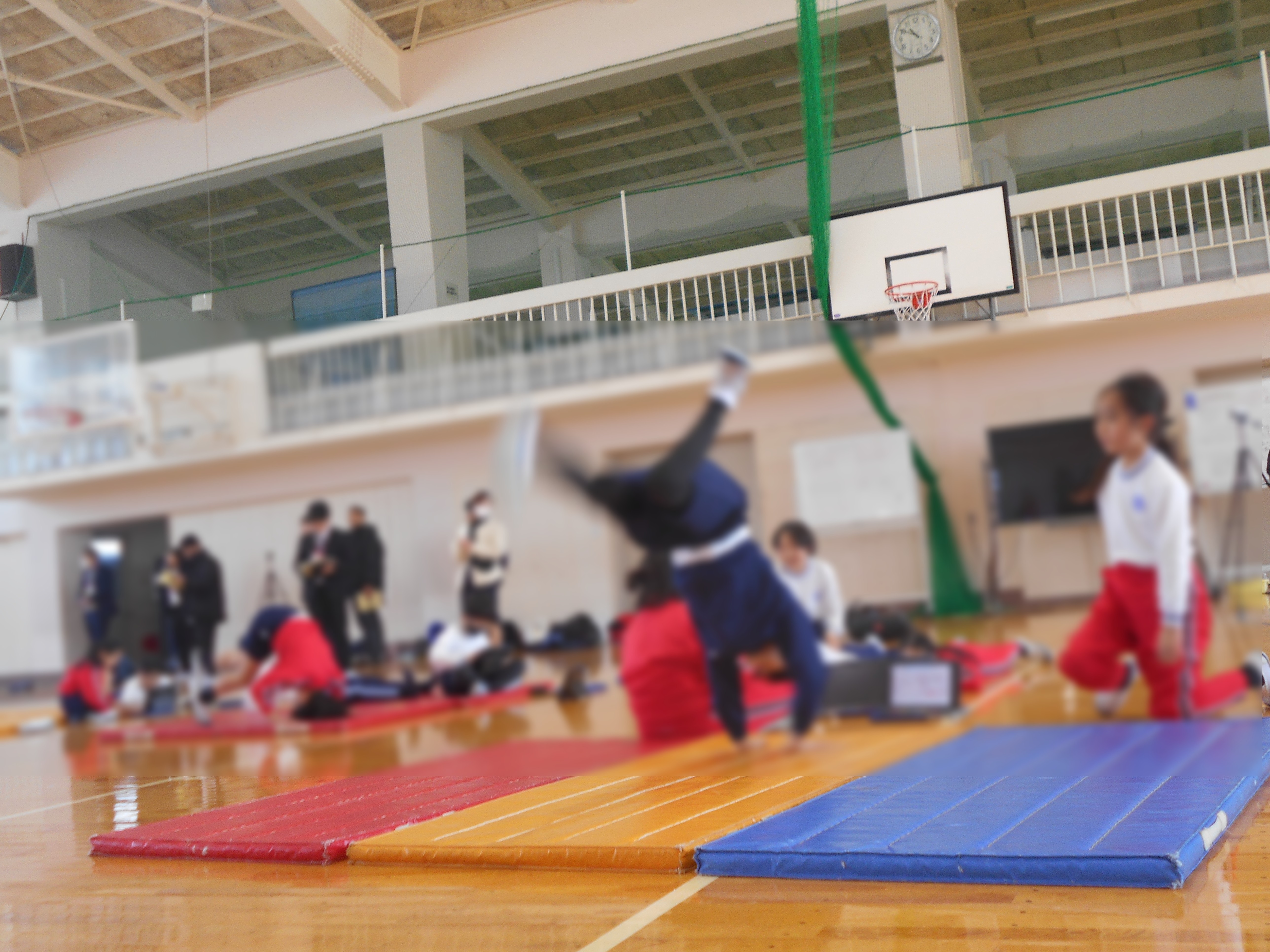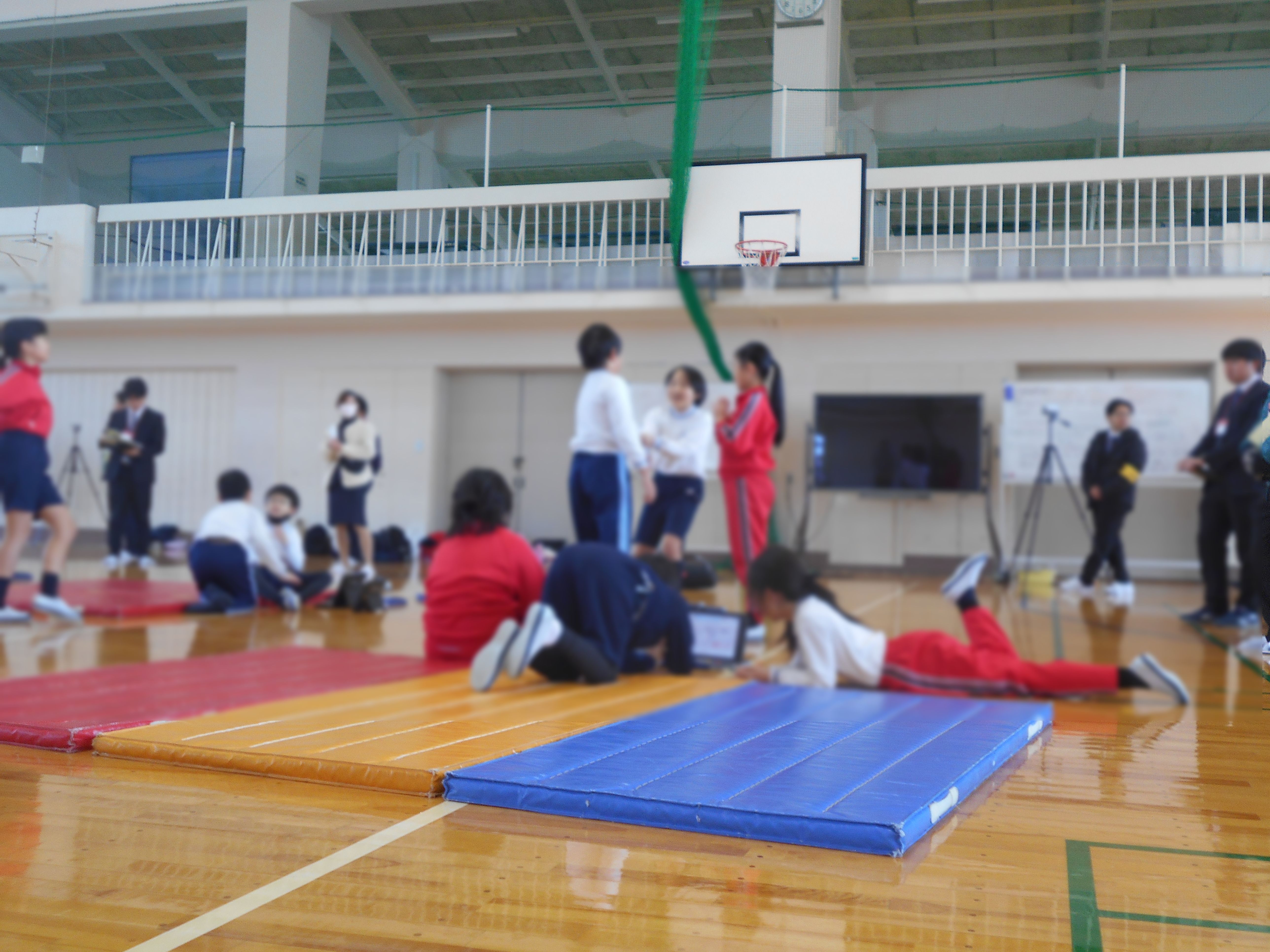 4年「動きを合わせよう」では、ブレイクダンスを踊る活動を行いました。子どもたちは、グループに合った曲を選んで、動きを合わせていました。また、タブレットを用いて、より「見る人」を意識した表現になるように工夫を重ねていました。