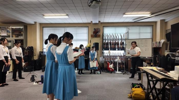 また、文化祭で行われる合唱コンクールのために、9月4日(木)に広島大学より、音楽(声楽)を勉強する学生さん(北村さん、新田さん、教育実習中の小原さん)にお越しいただき、すべてのクラスのソプラノ・アルト・テノールパートのレッスンしていただきました。
