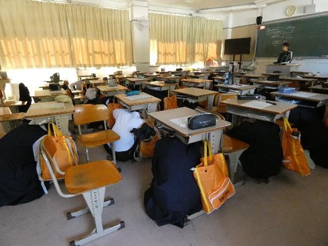 地震発生と同時に安全確保のため、机の下に身を隠し、