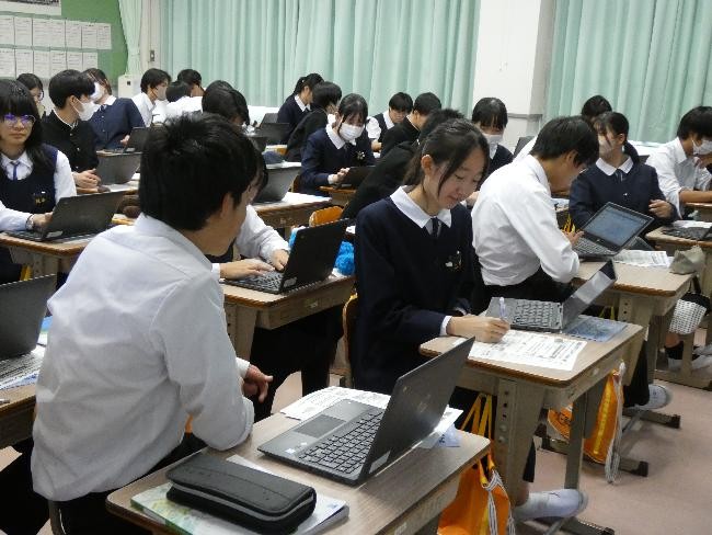 教室に戻ってからはクロムブックを活用し、一人一人が住んでいる地域のハザードマップと、どの施設であれば歩いて避難ができるかを確認しました。「自分の家は津波がきたらすぐに避難しないといけない」、「津波の到達は遅いかもしれないが、山が近くて土砂崩れが心配」など、自宅の立地からどのような被害が起こり得るかも考えました。