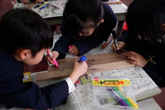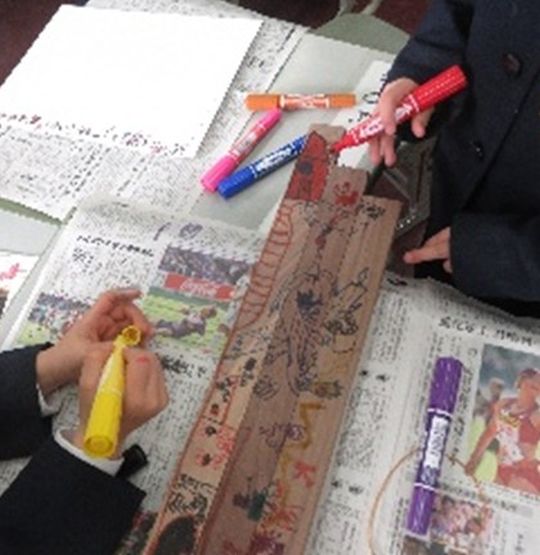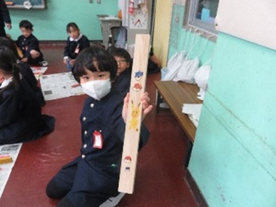 生徒が作成した音板は、小学校1年生にプレゼントして、小学校1年生さんが、とっても素敵なイラストや模様の描画、着色をして世界で1つだけのオリジナル楽器になりました。
