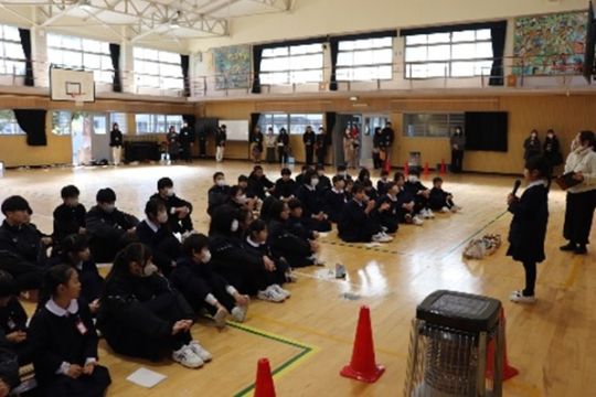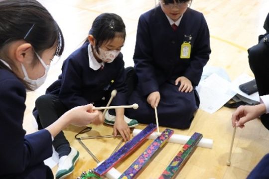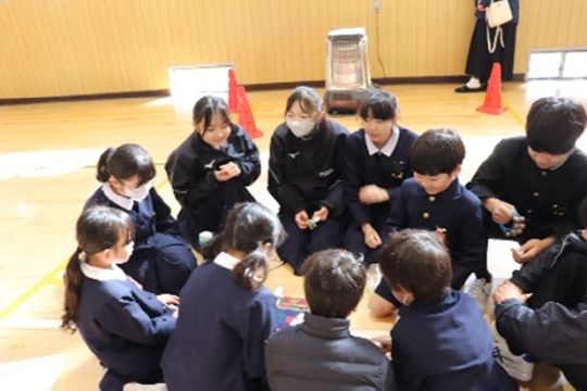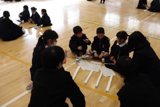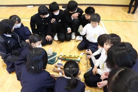 2月17日(火)に、小学校体育館で1・7交流を実施しました。これは、音楽科・技術科・理科の3教科合同のプロジェクト、端材活用プロジェクトの一環として行ったものです。