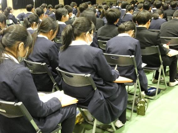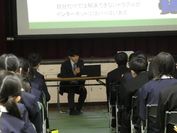 副校長先生からは、14歳以上20歳未満は刑事責任能力があり、罪を償う対象であるということ、また、自己承認欲求を満たすこととSNSを利用することを結びつけることは危険であり、ニュースで取り上げられる事件だけでなく身近なトラブルはたくさんあり、自分が巻き込まれたり、加害者になったりする可能性もあります。インターネットやSNSの適切な使用を心がけ、被害者にも加害者にもならないように注意していきましょう、というお話がありました。