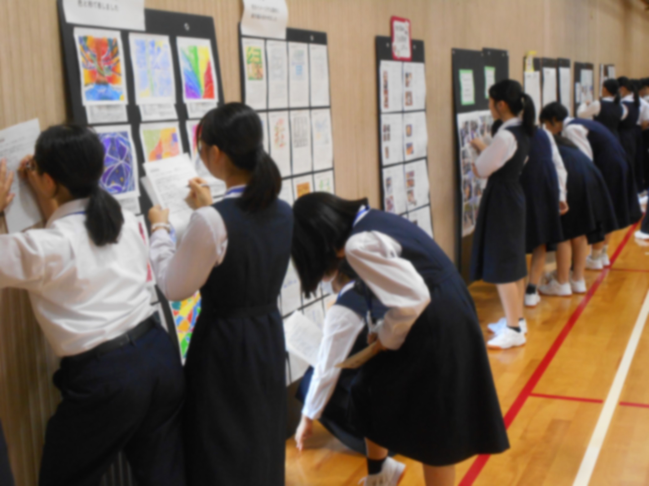 生徒達は同級生や先輩・後輩の表現物を鑑賞しながら,「この作品いいな」「来年は自分もこういうのをやってみたい」と話し合い,興味深く鑑賞していました。展示発表・鑑賞を通して,なかまの良さを認め合い,共に高め合おうとする姿勢がとても印象的でした。