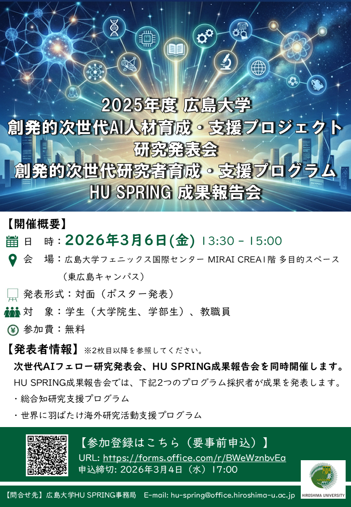 本イベントでは、広島大学の次世代AIフェローおよびHU SPRING支援プログラム(総合知研究支援/世界に羽ばたけ海外研究活動支援)採択者が、2025年度の研究成果をポスター形式で発表します。AI研究、学際的共同研究、海外での研究活動など、各プログラムの成果を一度に聴講できる機会となりますので、研究内容に関心のある方や、来年度以降、HU SPRING支援プログラムへの応募を検討しているフェローの参加を歓迎します。