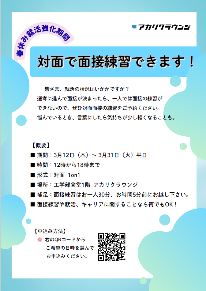 〇内容:お一人30分にて、対面形式にて面接の練習ができます。