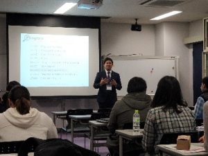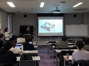 2019年11月27日(水)14:35~17:50 広島大学東広島キャンパスベンチャービジネスラボラトリー203講義室にて第8回講義が開講されました。学部生,大学院生および特別研究員などの履修生12名と,提案企業の株式会社ヒロツクの社員の方々が参加し,最終の企画発表会が行われました。