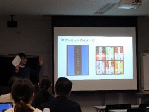 『GIFTs』チームは,日本のお歳暮やお中元などの季節の催事ごと贈りあう習慣に着目すると同時に,これまでのアンケート結果で,佃煮は自分で購入するよりも「もらう」方が嬉しいのではないかという仮説を立て,プレゼント購入を中心とした提案展開をしました。さらに,以前の研究や実際の事例を示すことでパッケージデザインの重要性を説き,コストをかけずにロゴやパッケージデザインを改善する提案として,クリスマスギフトをイメージしたプロトタイプを作成して紹介しました。将来的にはラッピング会社や印刷会社と手を組んでいくことを提案しました。