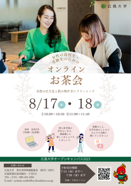 広島大学 男女共同参画推進室では、 8月17日(木)及び8月18日(金) のオープンキャンパスにおいて、女性の高校生・受験生を対象とした質問・相談コーナー「オンラインお茶会」を開催します。令和元年度までは女性の高校生・受験生の皆さんに広島大学について知っていただくため、学内でお茶やお菓子を囲んで開催していましたが、令和2年度からはオンラインで行っております。