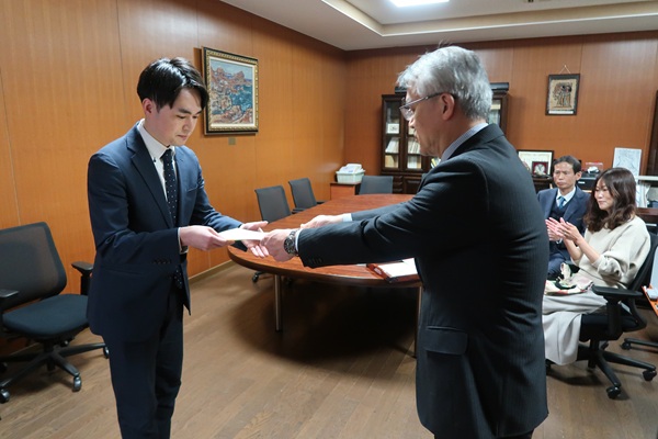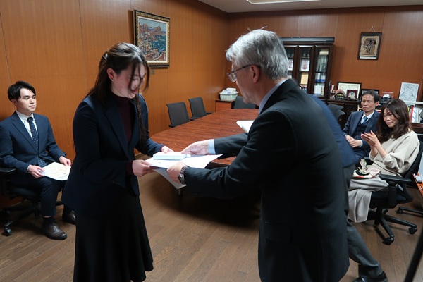 令和7年12月18日、文学部長室において、令和7年度広島大学エクセレント・スチューデント・スカラシップ成績優秀学生表彰状授与式(人文学プログラム)を行いました。