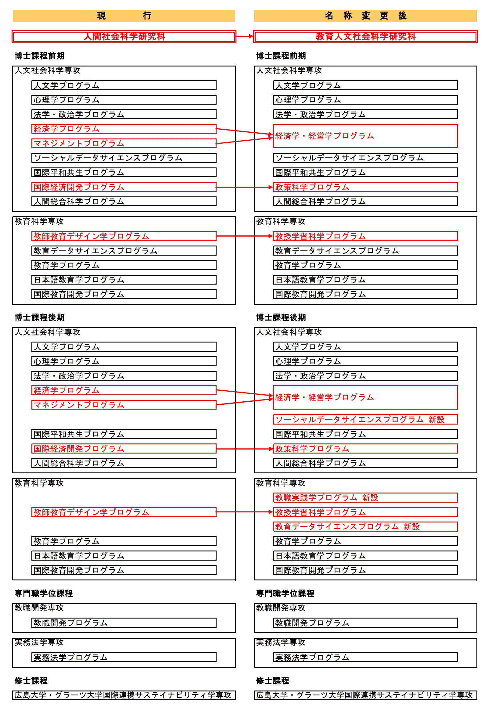 広島大学大学院人間社会科学研究科は、教育科学、人文科学、社会科学という3つの柱を明確に示すことを目的として、令和9(2027)年4月に「教育人文社会科学研究科」への名称変更及び学位プログラム の一部再編を構想中です。令和8(2026)年度に実施する令和9(2027)年度入学者選抜の合格者は、名称変更後の研究科(専攻)に 入学することになります。